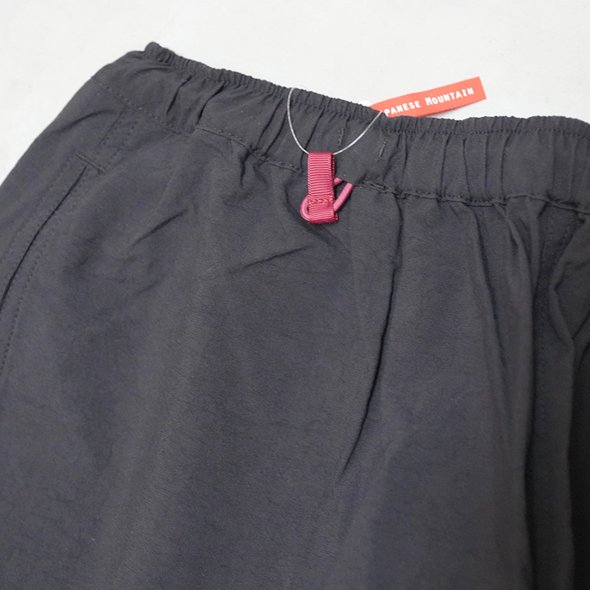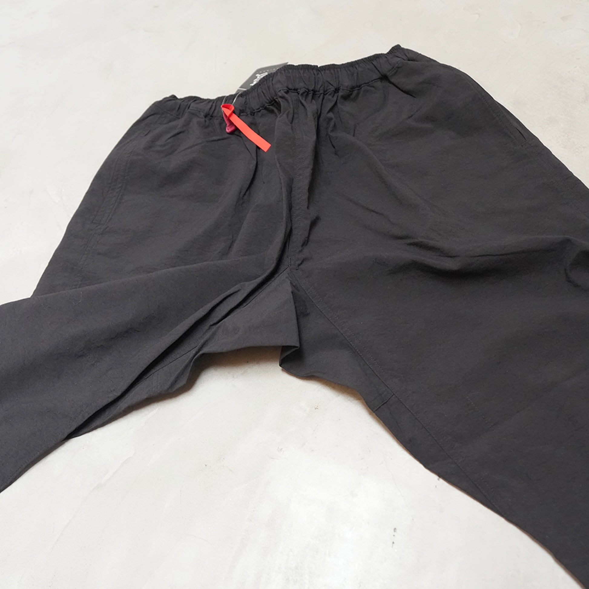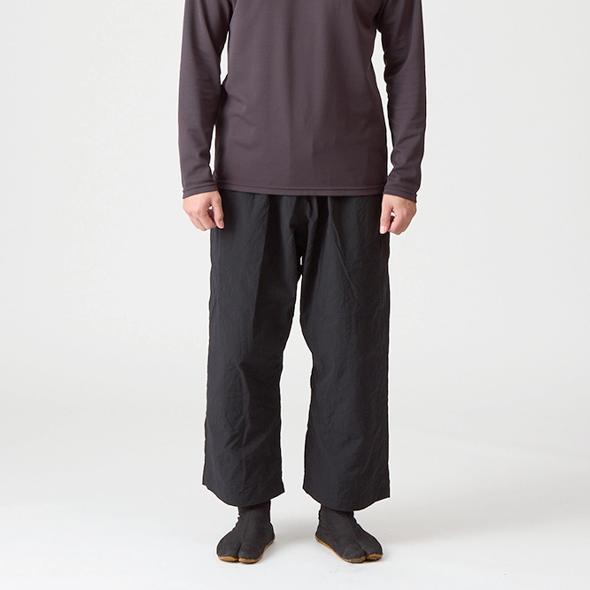 光沢がなく適度なハリコシのあるヴィンテージナイロン素材を採用したこのパンツは秋から春までのシノギングに最適です。使い勝手を考慮してウェストにストレッチドローコードを入れ、腰の両脇に前後に振り分けたポケットを設けていますが、それ以外は柔道パンツそのままの作りで、膝裏には共生地を宛てた補強が施されています。広い股のマチは膝があごに付きそうな急登の動きに難なく追従し、巾広で寸胴な作りによってワイドパンツならではのベンチレーション効果を得ることができます。光沢のない落ち着いた風合いで適度なハリコシのある、シノギングに必要な強度を備えたヴィンテージ加工のナイロン素材です。ほど良い通気性と防風性を備え、撥水性も備えています。