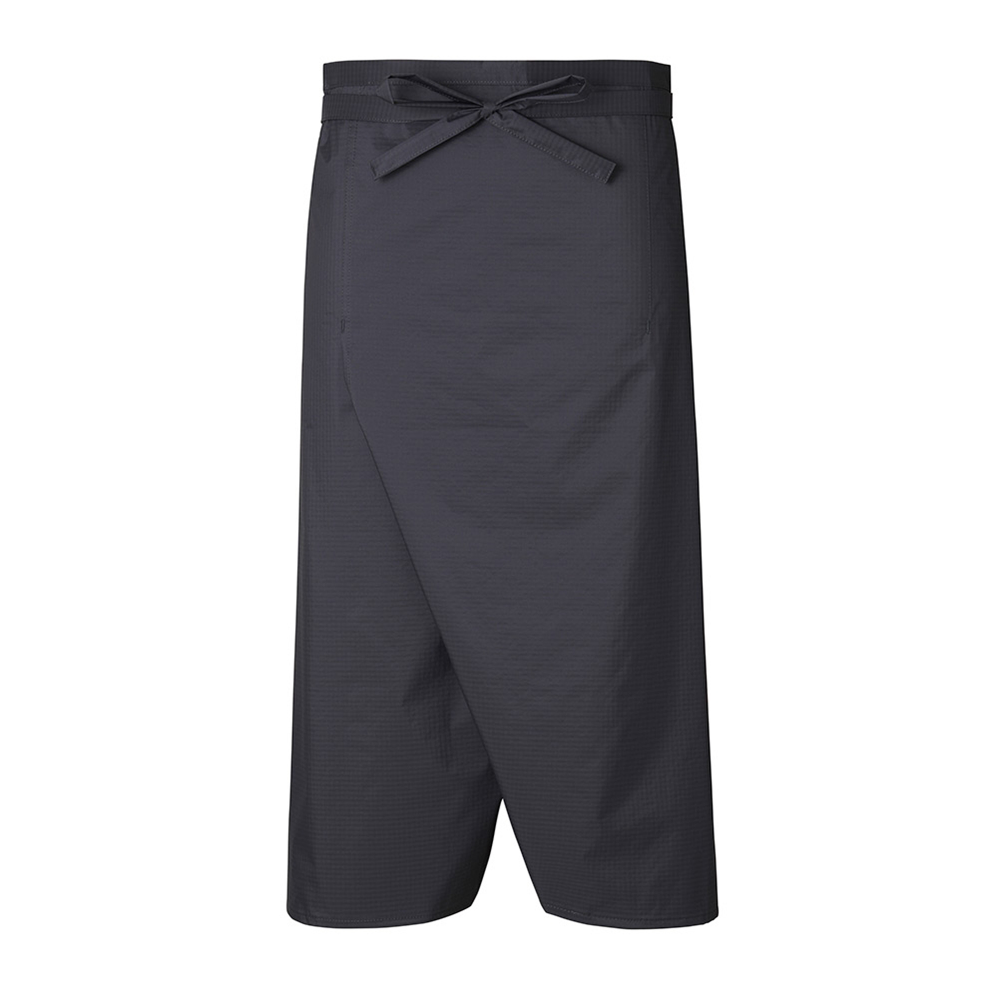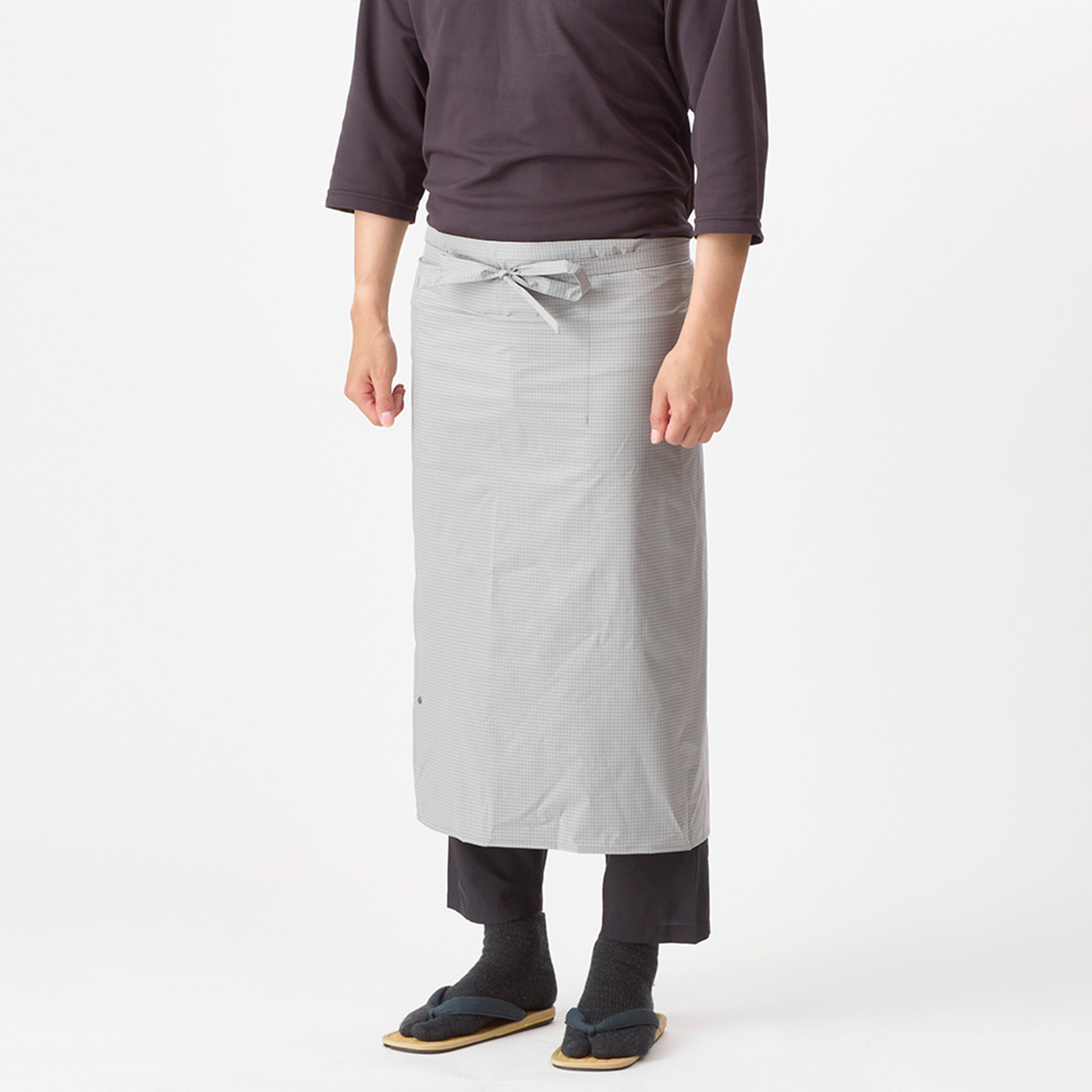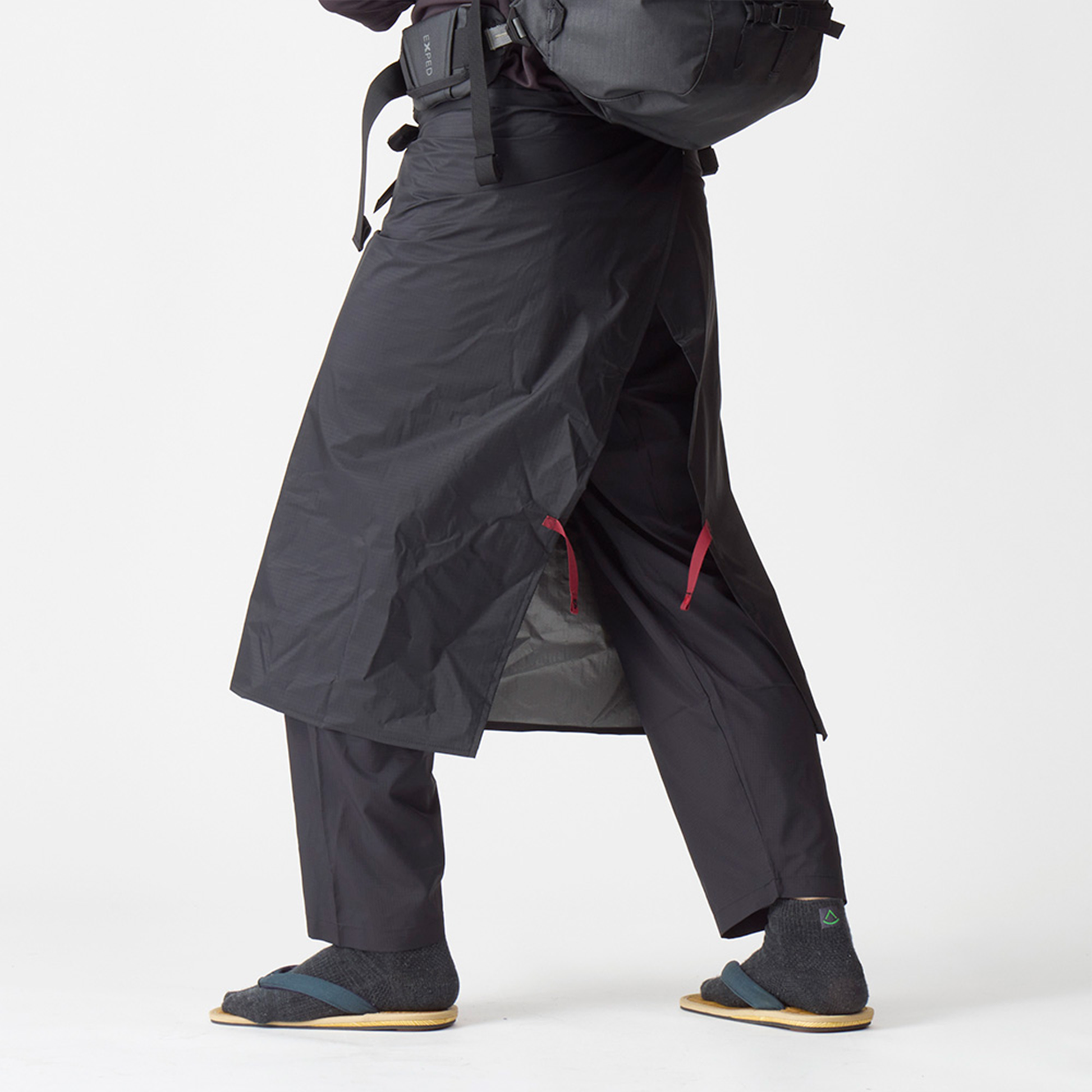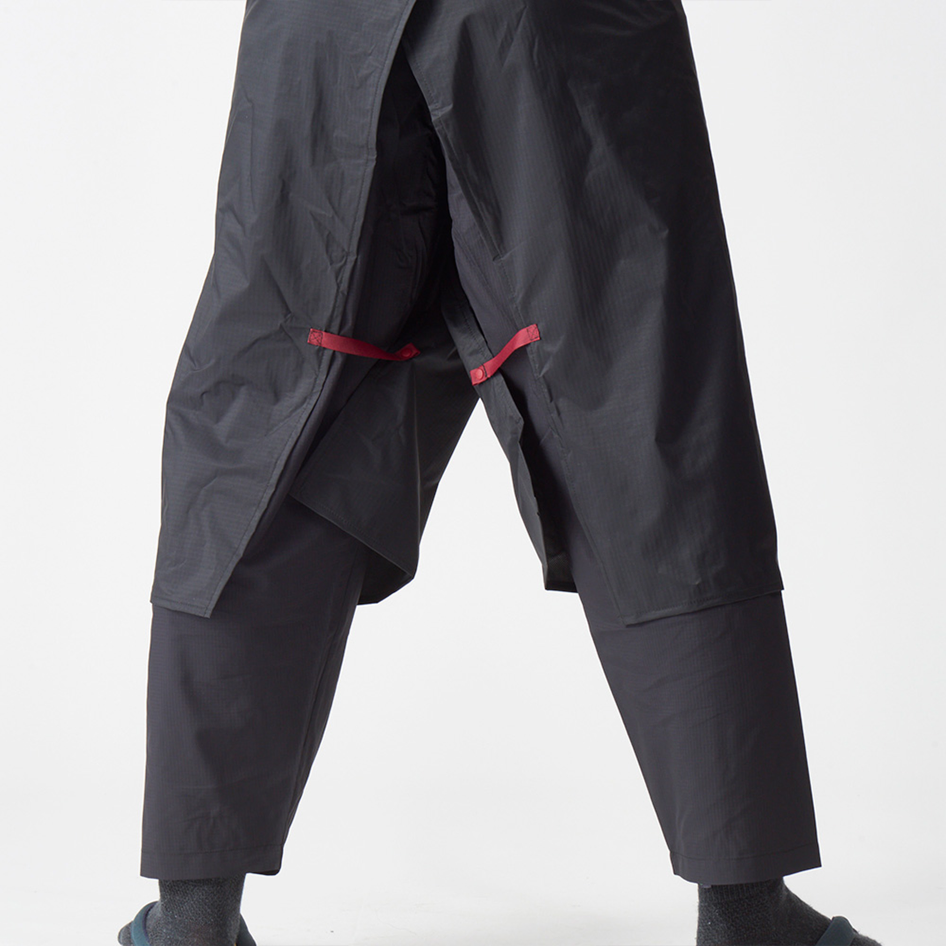 シノギングのフィールドにおいて、レインパンツとは比べ物にならないくらいの運動性とベンチレーション性が実感できて、必要十分な防水性を備えた前掛け型の雨除けです。前掛け型なので後身はカバーしません。後身が開放されているので状況によっては雨に濡れる場合がありますが雨を凌ぐという意味では十分です。少しでも濡れることを避けたい場合にはこの商品を選ばないでください。後身が開放されているので優れたベンチレーション効果と動きやすさを得ることができます。それだけでも十分動きやすいのですが、前中心に生地を重ねて裾を割ることでさらに動きやすさを追求しています。風によるバタつきが気になるときには、脇のテープを膝裏にまわして止めて簡易パンツモードで凌ぐことができます。雨だけではなく風や寒さを凌ぐ事もできるので一年を通して出番の多いアイテムです。どことなく和の印象が漂う独特なリップストップナイロンに、耐水圧10,000mm、透湿量7,000g/cm²/dayの防水透湿コーティングを施した2.5層構造の素材を使用しています。2.5層の素材は3層素材のように雨や汗を吸収する生地が裏面に存在しないのでその分早く乾きます。防風性と撥水性も備えているので風にも強く雨や汚れを弾きます。