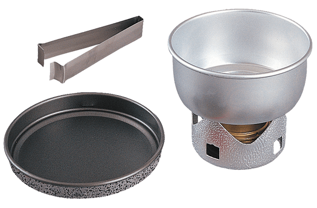 アルコールバーナー本体と専用ゴトク(TR-281)、0.8ℓのソースパン、ミニフライパン、ミニハンドルがセットになったクッカーセットです。