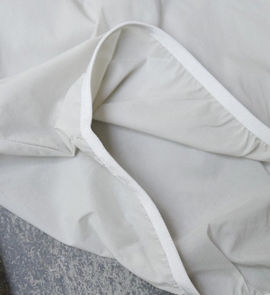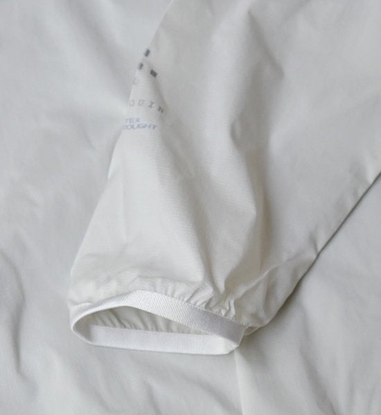 ダウンプルーフ素材を使用した一般的な防風ジャケットに比べ約25倍も通気性に優れているハゴロモは、適度に風を通し続けるので衣服内に湿気をため込みません。何か一枚着ていたい歩き始めから汗をかく峠への登り、風の抜ける尾根道までを着たままで快適にシノギングできます。前開きの長いファスナーは下からも開くので中に着けたチェストパックなどにアクセスできます。