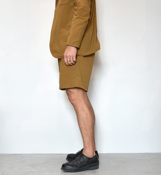 ALPHADRYを使ったイージーショーツ。ALPHADRYは、吸汗拡散性の高い微多孔質活性粒子のココナパウダーを練り込んだポリエステル繊維です。衣服内をドライで快適に保ちます。フラップ付き後ポケットの袋布には通気性の良いポリエステルメッシュを使用。また腰ポケットのドットボタンは座った際にスマートフォンなどの落下を防ぎます。「