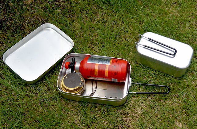 取手付きアルミ製飯ごう(メスティン)です。小物入れにも便利です。熱伝導率の高いアルミ製のため、熱が全体に回り、アルコールバーナーでもごはんが大変美味しく炊けます。