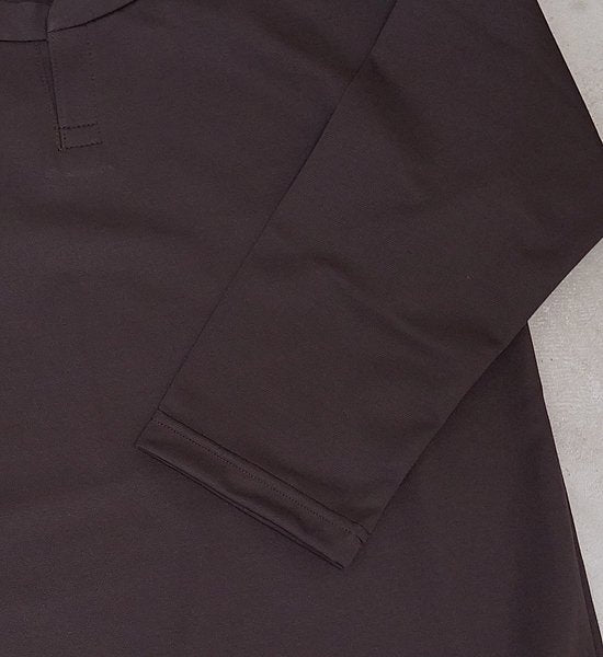 肌面にメリノウール、表面に吸汗ポリエステルを配した 七分袖の アクティブレイヤー。急な尾根を直登して噴き出す汗を肌側のウールが蓄えつつも積極的に表側に拡散して乾かす機能に加えて汗垂れしにくくて汗のにおいが残りにくいといった点でメリノウールの機能を実感できます。ハイブリッド構造の高機能レイヤーですが、日本の伝統色で深みのある色に染め上げられた落ち着いた一面も持ち合わせています。もうすぐあたたかくなる八十八夜の頃から秋の気配を感じるころまで快適に使用できます。