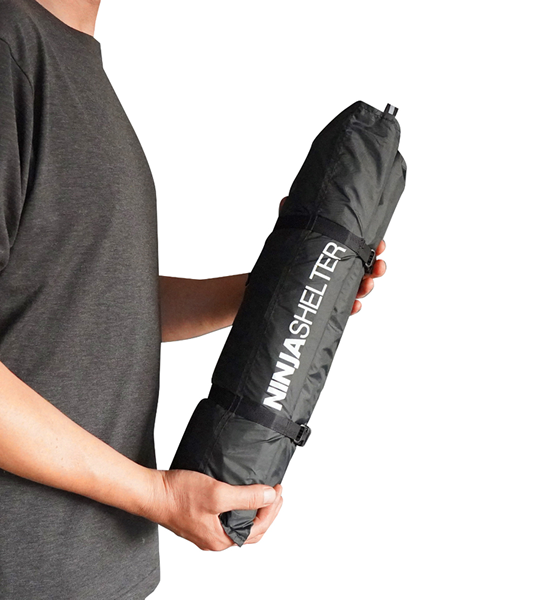 付属のケースはロールアップ式。両サイドに入れたタープポールが芯になり、素早くコンパクトに巻き込みが可能です。付属のペグや別売りのNINJA NESTも一緒に収納できます。