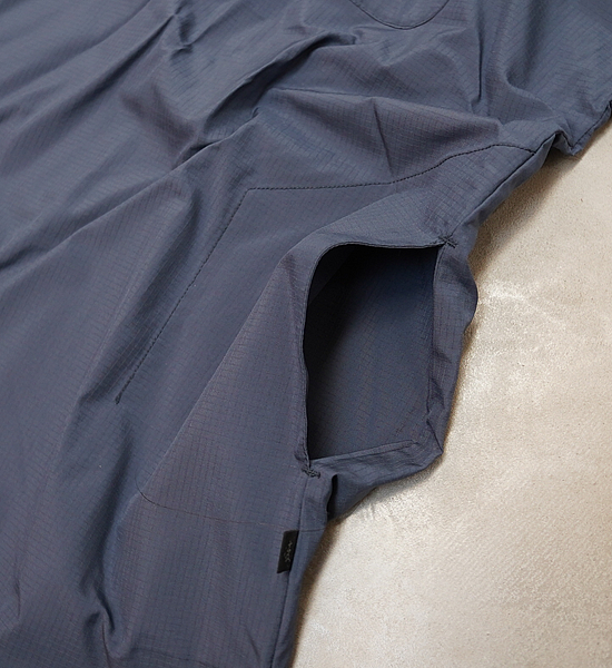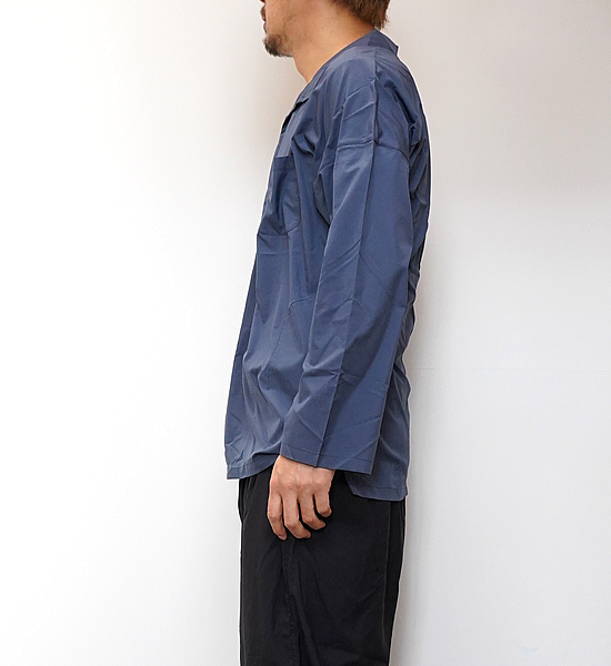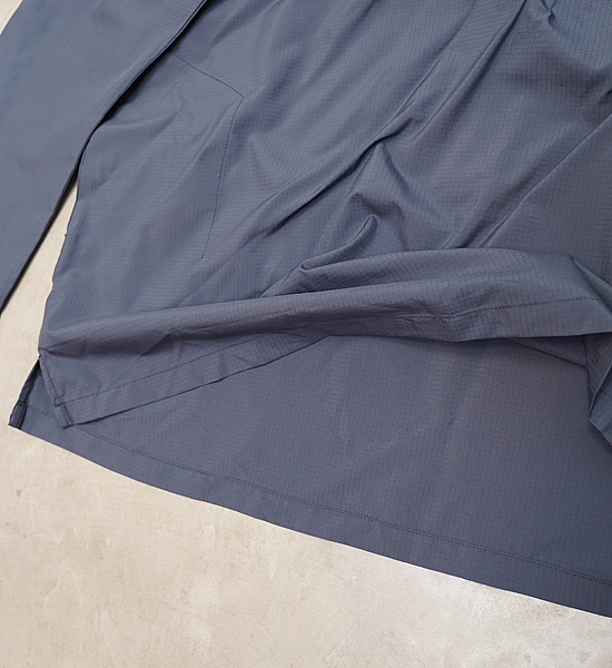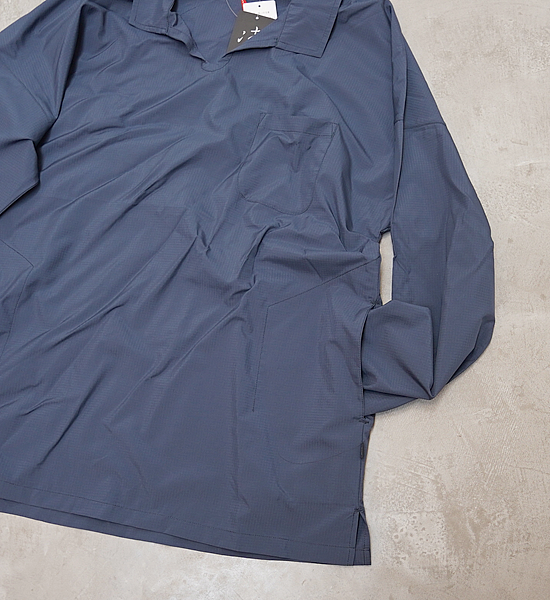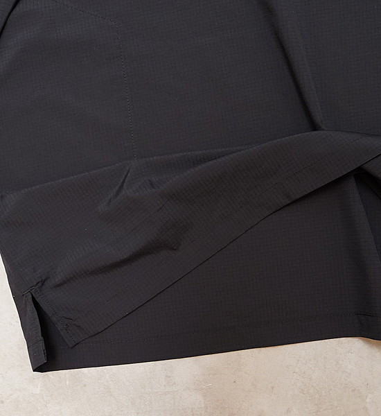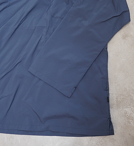 蒸し暑い低山でもべたつかないサラサラな肌触りと、風を受け入れてウェア内の空気を循環させる高い 通気性、ちょっと丈が長くてルーズなシルエットが特長の快適すぎるプルオーバーシャツ。ズバ抜けた 通気性のおかげでプルオーバーでありながらシノギング中に暑苦しさを感じにくく、とても軽くてコン パクトに収納できるので、お泊りシノギングの着替えとしても有効です。気になるルートを調べながら 木陰でハンモックに揺られたり、露岩のてっぺんで風に吹かれたりと、道草をするには最高の一枚です。