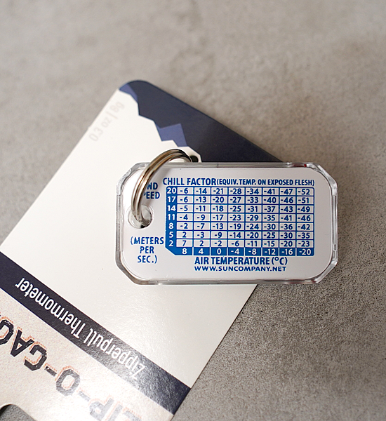 ジップオーゲージは裏面には風速と温度から算出する、ウインドチルの表がついている温度計付きキーホルダーです。