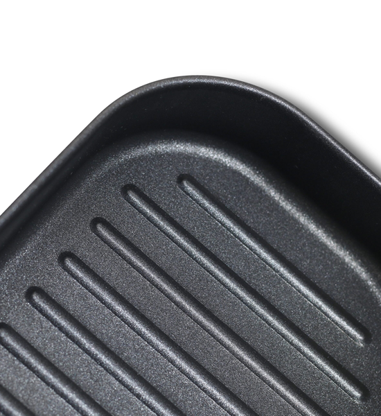 フライパンの底面にはリブ加工を施し、焦げ付き防止と強度アップを両立しています。フライパンと深なべは、手入れの簡単なフッ素樹脂コーティングを施しています。