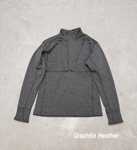 保温性の高いハーフジップモデルです。ベースレイヤーとして着ても、ミッドレイヤーとしても快適な1.5 レイヤーとして開発しました。顔に当たらないようオフセットされたセンタージッパーは、ダブルスライダー仕様でベンチレーションとしても使用でき、長めのジッパーで着脱も容易。体にフィットするタイトなシルエットですが、優れたストレッチ性で着ていることを忘れるほどの着心地です。
