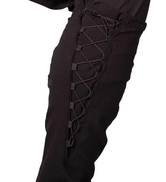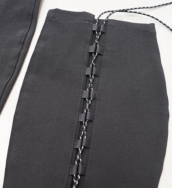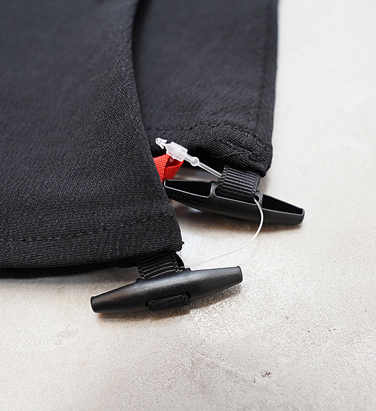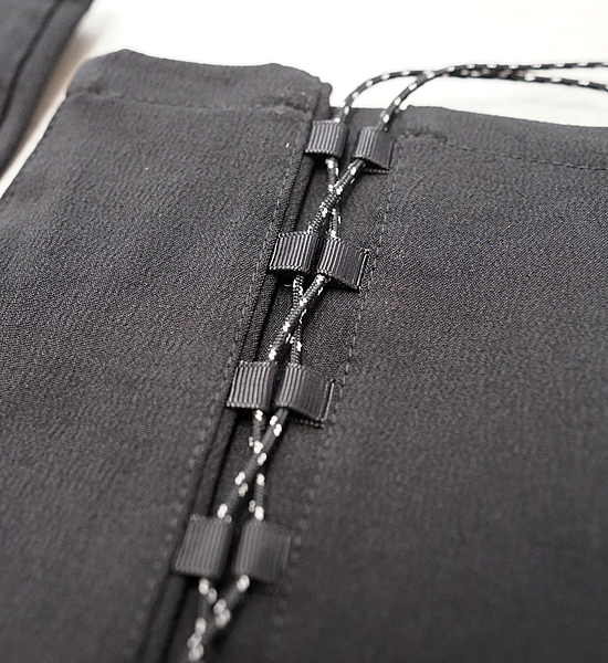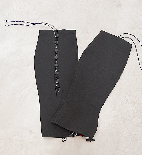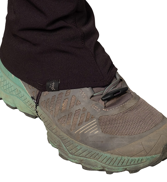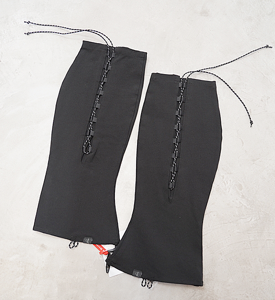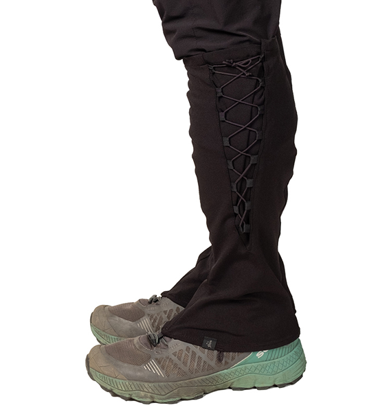レインゲイターよりも快適に広範囲に使用できるソフトシェル素材のロングゲイター「クナイ」。踏み跡の乏しい尾根 や渓を歩くシノギングには、シューズへの異物の侵入を防ぐゲイターは欠かせません。登山・ハイキングをやってい た頃は、防水生地のいわゆるレインゲイターを使っていましたが、生地の透湿性が発汗量に追いつかないために蒸れ て結露したり、どうしてもきっちりハマらない金属製のフックにイライラしたりと頭を悩ませていました。その後に 凌を始めることになるわけですが、その時に目に止まったのが地下足袋で、ストレッチ性のない生地でも足にフィッ トするようにできている地下足袋の作りは大いに参考になりました。これに編み上げ式の紐締めをミックスすること でふくらはぎのフィットを容易に調節できるようになり、足さばきの邪魔にならず藪漕ぎや長時間のシノギングにも ストレスを感じないゲイターが出来上がりました。あのイライラの原因だった金属製フックの代りにトグルを使用す ることで簡単に確実に固定できるようになりました。裾の左右のループはシューズの底にまわすバンジーコードや丈 夫な細引きを固定するためのもので、こうすることで激しいシノギングにおける裾の浮き上がりを防ぐことができま す。また、かかとの裏面に面ファスナー(ループ)を縫い付けているので一部のシューズに容易に固定できます。