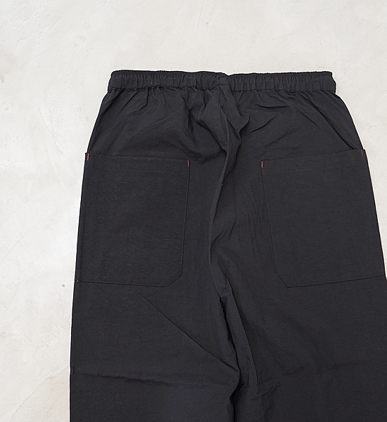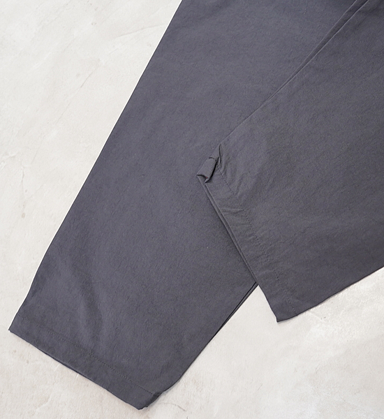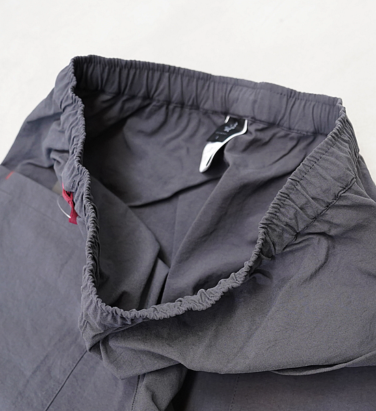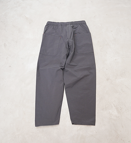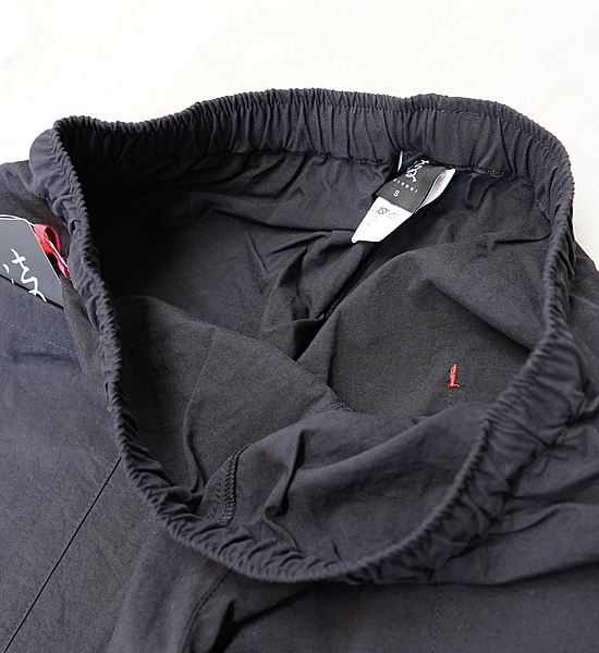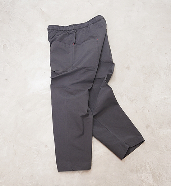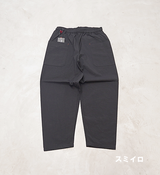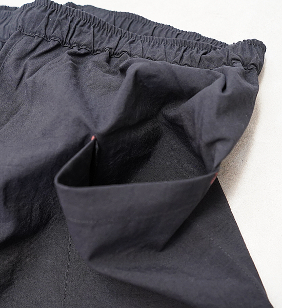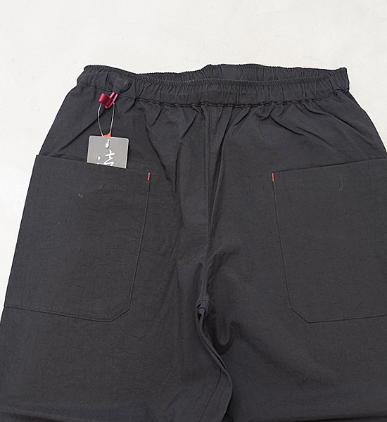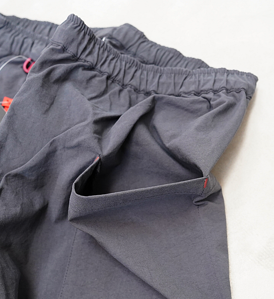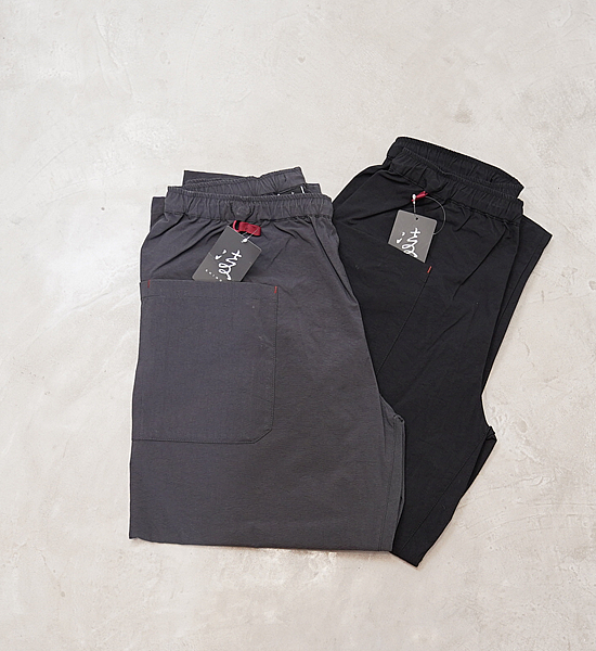 低山には似合わない大きいバックパックを背負って、ハンモックポイントまでの尾根を落ち葉に埋もれそうな踏み跡 を辿る。そんな静かな秋の低山を楽しむための、中途半端な丈が丁度いい、秋を感じて歩くパンツです。光沢を抑えた自然な風合いのヴィンテージ加工ナイロンです。やや太番手の糸を使用しているので引き裂き強度と耐 摩耗性に優れており、適度な防風性、撥水性、通気性を備えています。山仕事の作業着として使われていた野良着を再現しているので、ヒップから膝に掛けて少し太めになっていて動きに ストレスを感じません。また、膝から裾に掛けて細くなっているので悪い場所での足元確認がしやすくなっています。 他に、ナイロンベルトを排除してスッキリしたウェスト周り、バックパックのヒップベルトに干渉せず行動中に使い やすい位置にあるサイドポケットなど、凌ならではのアイデアを足して着心地を向上させています。 マタギを合わせてアクセントにクビマキを使うと素朴なデザインのパンツが生きるでしょう。それにハンテンを羽織 れば乙な着こなしの出来上がりです。