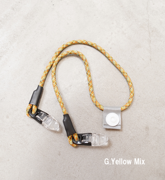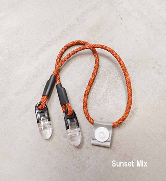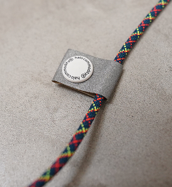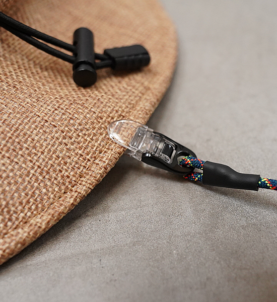 帽子とアウターをしっかりと留めておけるクリップタイプのハットコード。思わぬ突風などで帽子が飛ばされた時の保険として。オリジナルカラーで製作したコードを使用しています。先端に付けたリフレクトテープは夜間の使用時の視認性を担っています。