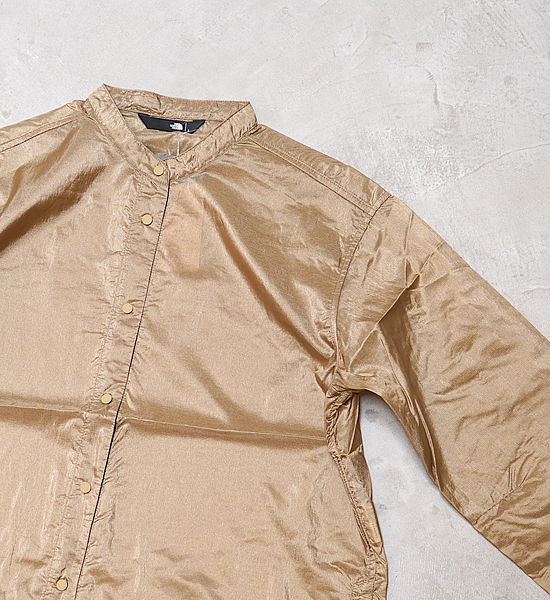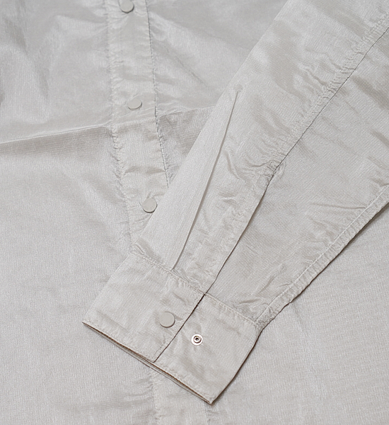 ウインドジャケットのように着ることもできる、軽量・コンパクトな長袖シャツ。ひし形状の糸を織ることで糸と糸のすき間を減らし、摩耗に強い特長を持つリサイクルナイロン生地を採用。薄く、適度なハリのある生地はやや光沢があり、さらりとした着心地です。はっ水加工を施し、多少の雨にも対応。両脇にはスリットがつき、ボタンで留めることもできます。首周りがすっきりと見えクリーンな印象のスタンドカラーで、フロントは着脱が簡単なスナップボタン仕様。 静電気の発生を抑える静電ケア設計採用。カジュアルな着こなしも楽しめる、汎用性の高いテクニカルシャツです。