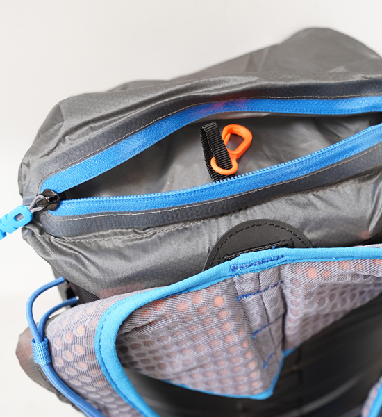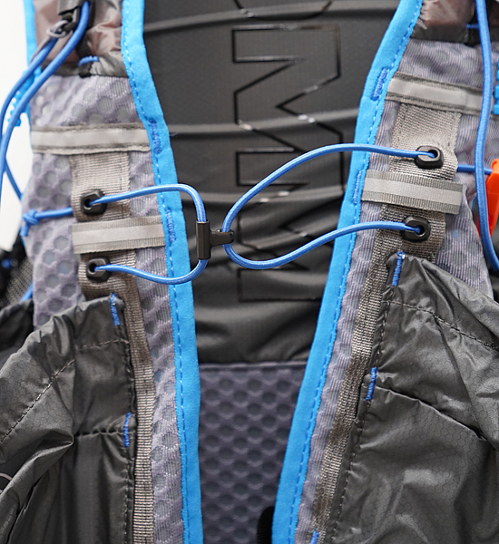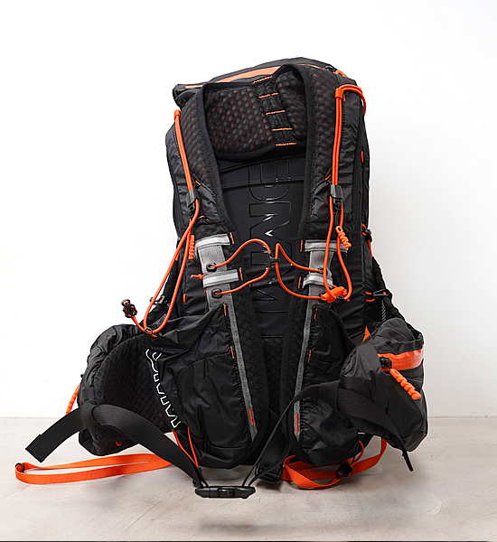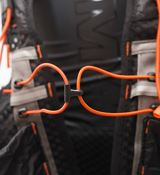 最大の特徴は7つの支点でパックの揺れを抑える独自のハーネスシステムです。首の後のY字型ハーネスがパックの重心を身体の中心=背骨に固定し、肩周りの動きを妨げないため、より自然なランニングフォームを可能にします。