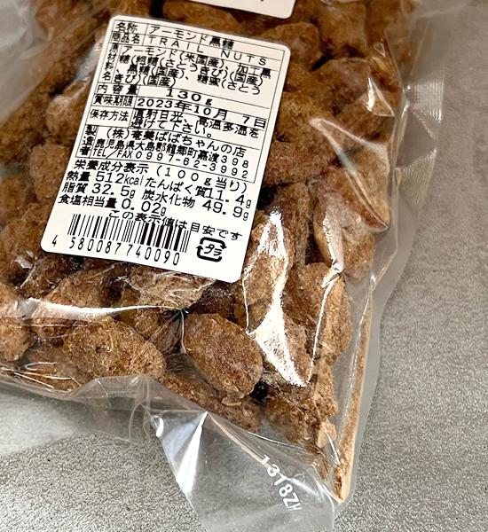 | 原材料名 | アーモンド(米国産)/加工黒糖(粗糖 さとうきび)(国産)/黒糖(国産)/糖蜜(さとうきび)(国産) |