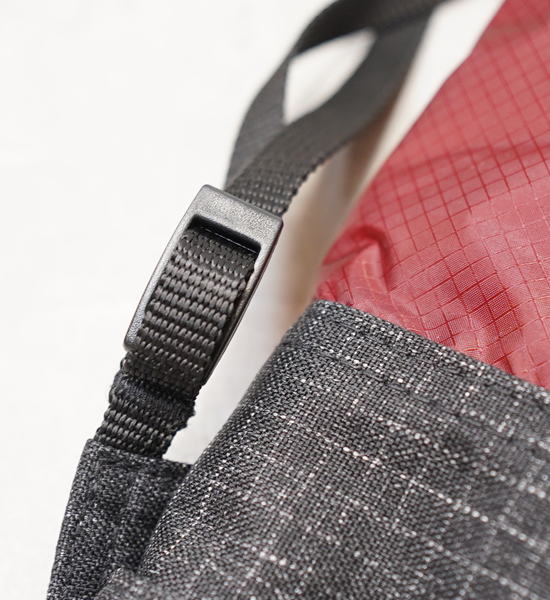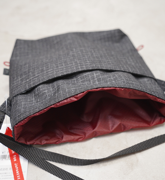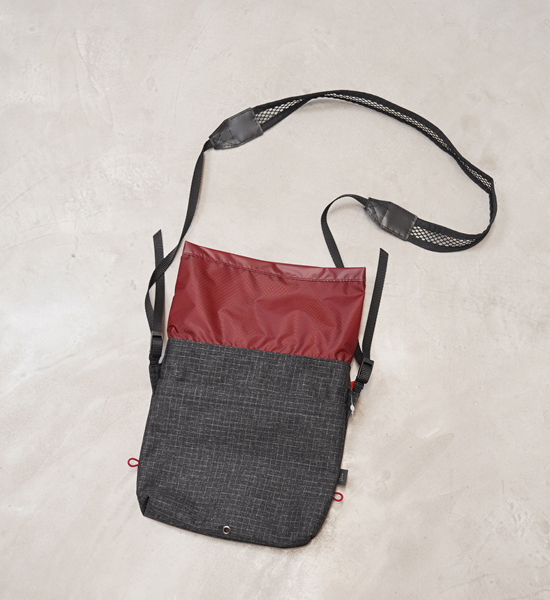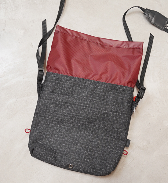 地形図、コンパス、ペン、スマートフォン(カメラとして)、お財布やフォールディングナイフなど最低限の物を収納できるシノギング用のショルダーバッグです。口布のフラップを倒しておくだけで十分にクロージャーの役目を果たし、雨や 雪、異物の侵入を防げることは長年のシノギングで実証済みです。開口部を絞りたいという人のために、口布上部の左右を縫い開けあるので、お好みに応じて細引きとコードロックを追加して閉じることができます。その他に、ショルダーベルトをメッシュにすることで部分的な蒸れを軽減したり、ポケットの中に水がたまらないように水抜き穴を設けたりするなど使い心地を向上させています。素材は高強力ポリエチレン繊維のSPIDERONを使用した堅牢性に優れるリップストップ素材で、見た目のわりに軽く、裏面にポリウレタンのダブルコーティングが施されて いるので耐水性があります。また、適度なハリがあるので型崩れしにくく、収納品の片寄りも防ぎます。