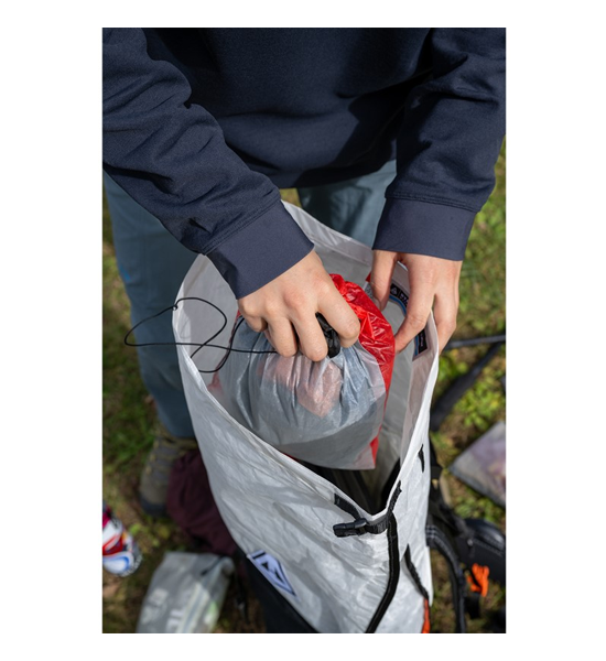 Spinnakerという、ヨットのセイル素材を使用したスタッフバッグ。非常に軽くて丈夫な素材です。最初はカサカサと音がしますが、使い込むと音は気にならなくなり柔らかくなっていきます。着替えなどを入れやすいA4サイズ。開口部は底部よりも広めに入れやすくデザインしています。敢えて底マチを設けずザックの隙間に入れやすくしています。