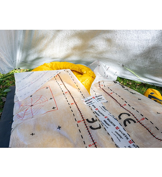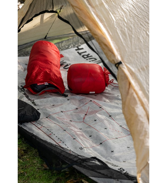 透湿性を備えた丈夫な防水シート。フィルム状の表面は水を通さないので、グランドシートやテントマットとして使用する際は水に触れる地面側に表面を向けて使用します。寝袋の上に掛ければ結露対策として水滴から寝袋を守ると共に温度を保つ役割もします。