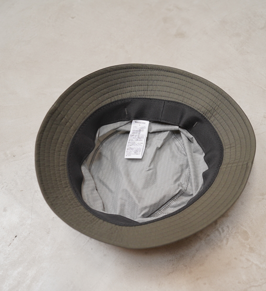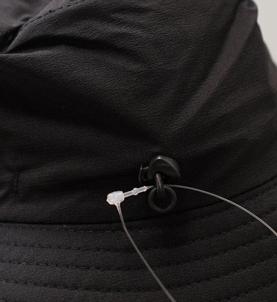 防水透湿素材「ハイベント」を使用したカジュアルな防水ハットです。メイン素材には、リサイクルナイロンを使用して環境に配慮したアイテム。軽く、薄く、やわらかな風合いで、丸めて携行することも可能です。額肌面には吸汗メッシュを配置し、快適性をアップ。後部側には、サイズ調節が容易にできるドローコード付きアジャスターを装備。トレッキングから野外フェスまで幅広く使えるアイテムです。