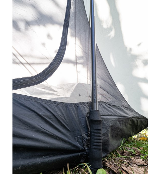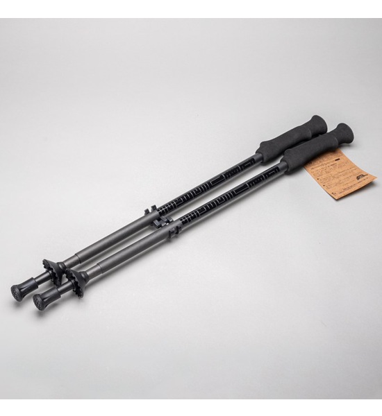 軽量化のためストックシェルターを使い、ダブルストックの推進力で長距離を目指すハイカーのためのカーボンポールです。グイグイとポールをプッシュする方のためにストラップは別売りで用意してあります。シェルター向けにサイズ調整も可能で最大で135cmまで伸ばすことが出来るようにデザインしました。