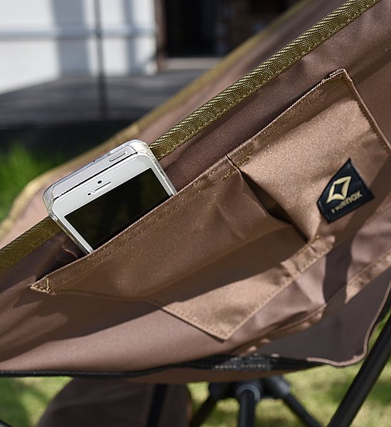 Helinox ヘリノックス タクティカルチェアはHelinoxコンフォートチェアのミリタリーラインです。所々に通常ラインとは違うこだわりが盛り込まれています。収納袋がポリエステル生地のジッパー付きになり、袋をフレームに付けることで小物を入れることができるポケットにもなります。また背面両側にはポケットも付いています。背面にはベルクロが付いているので、ワッペンなどを付けて自分の目印を付けることも可能です。シンプルでありながら座面が吊り下げられているので、驚くような座り心地の良さです。頑丈なポリエステル生地と超高力アルミフレームで、キャンプ、ホームどちらでもいつでもどこでも便利に使用できます。