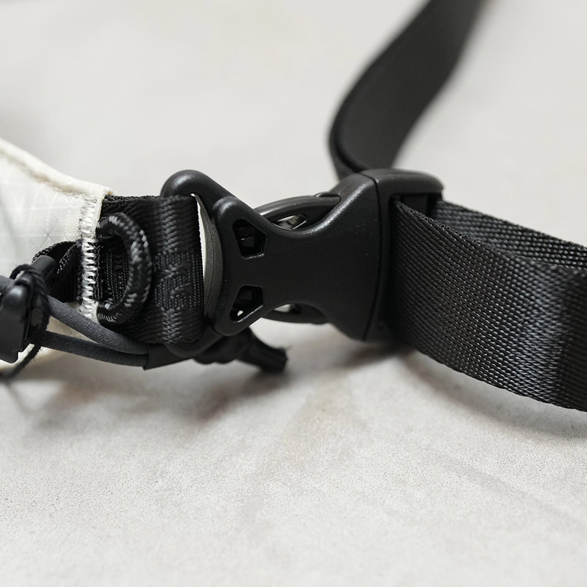 表生地は、漁網や海洋廃棄物からリサイクルしたナイロン素材に高強度ポリエチレンをリップストップ状に織りこんだ環境負荷の少ない素材を使用しています。裏地にはペットボトルをリサイクルしたポリエステル素材を使用しています。フロントのジップポケットやコンプレッションのドローコードには、リフレクタータイプのものを使用しています。実測容量1.5L