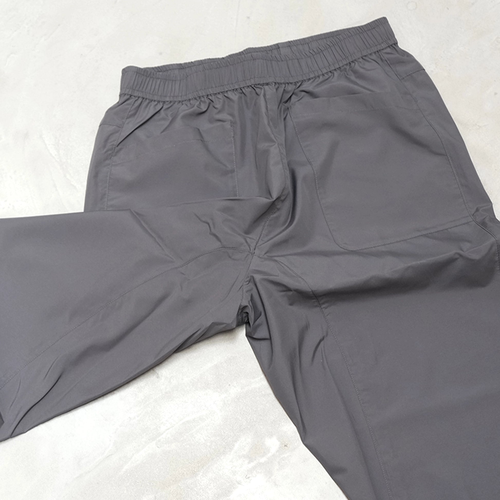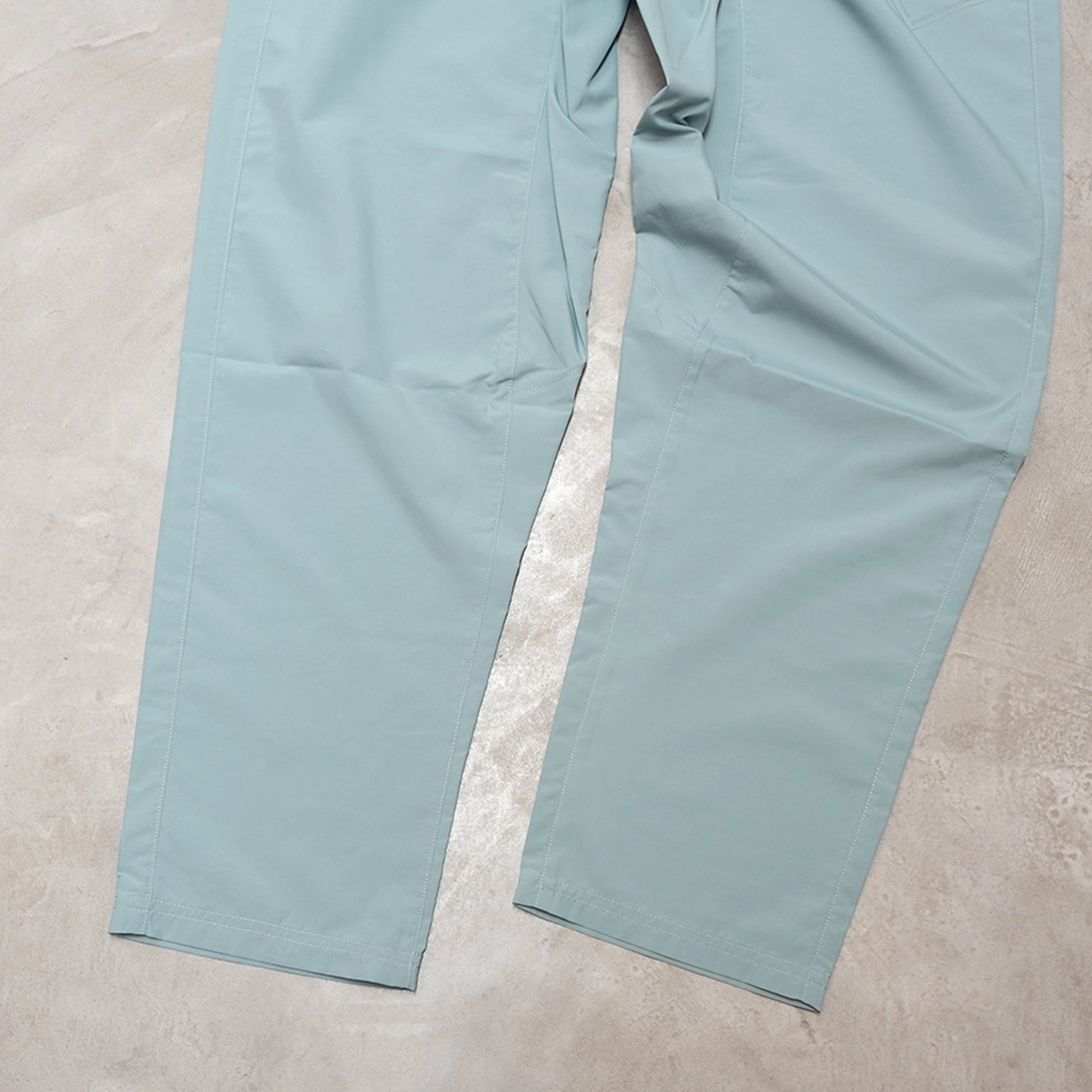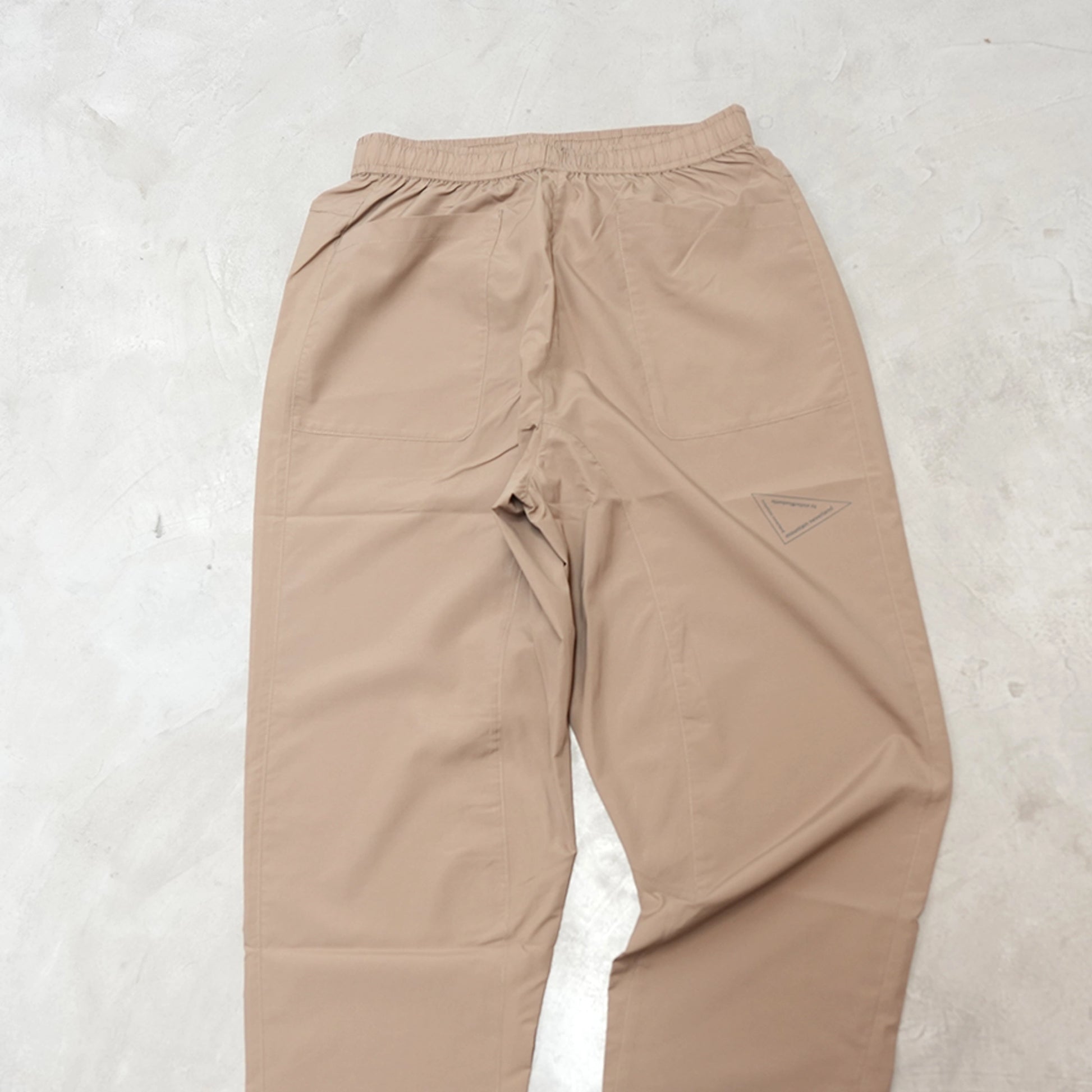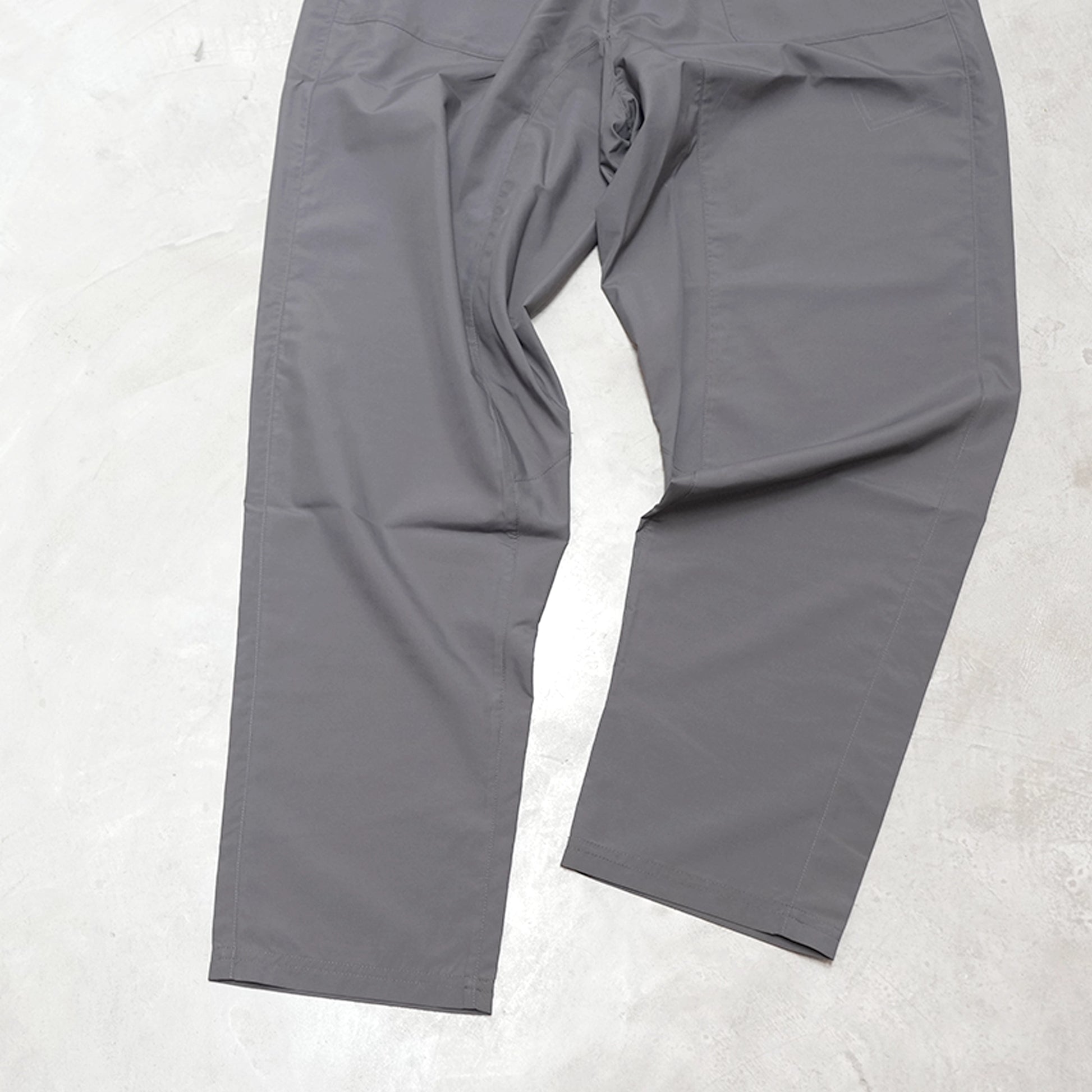 夏の山用パンツ、Hiker’s Summer Pants。素材はポリエステル100%。薄くて軽く、さらっとした生地なので履き心地がとても良く、また撥水性能が特徴的。一般的な撥水剤によるものとは違い稲の穂が水を弾く仕組みと同じマイクロガーター構造という手法で水を弾きます。(防水ではありません。)汗抜けと速乾性もこの生地の特徴です。ストレッチしないためできだけ足さばきがし易いよう幅は少し広めで、裾はゴムではないですが広くなりすぎない幅です。ウエストはゴム。ポケットは山と高原地図がすんなりと収まる深さです。パッカブルではないですがコンパクトになります。
