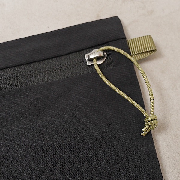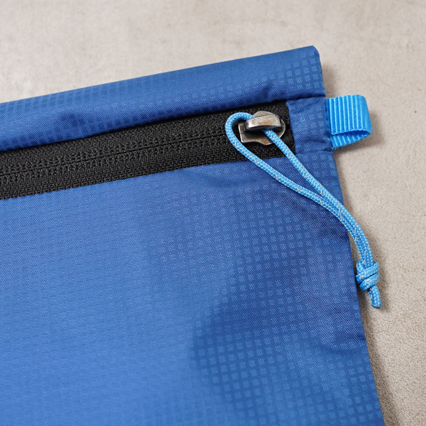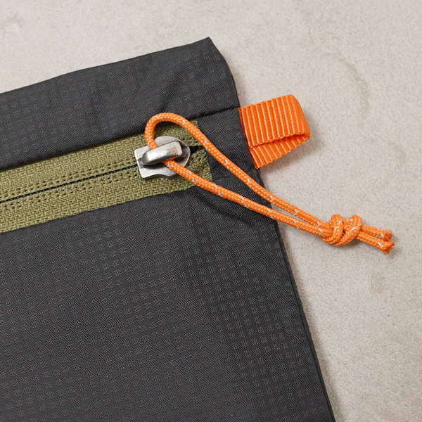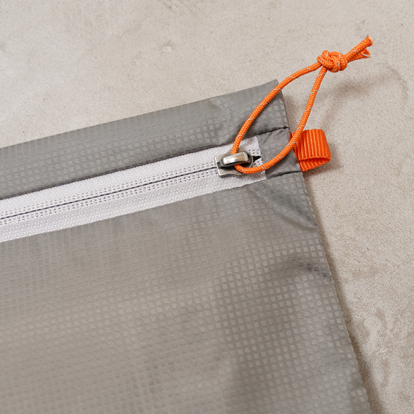 バックパックの残反を有効利用し生産したジッパーつきポーチ。いずれもバックパックで使用している高機能素材です。