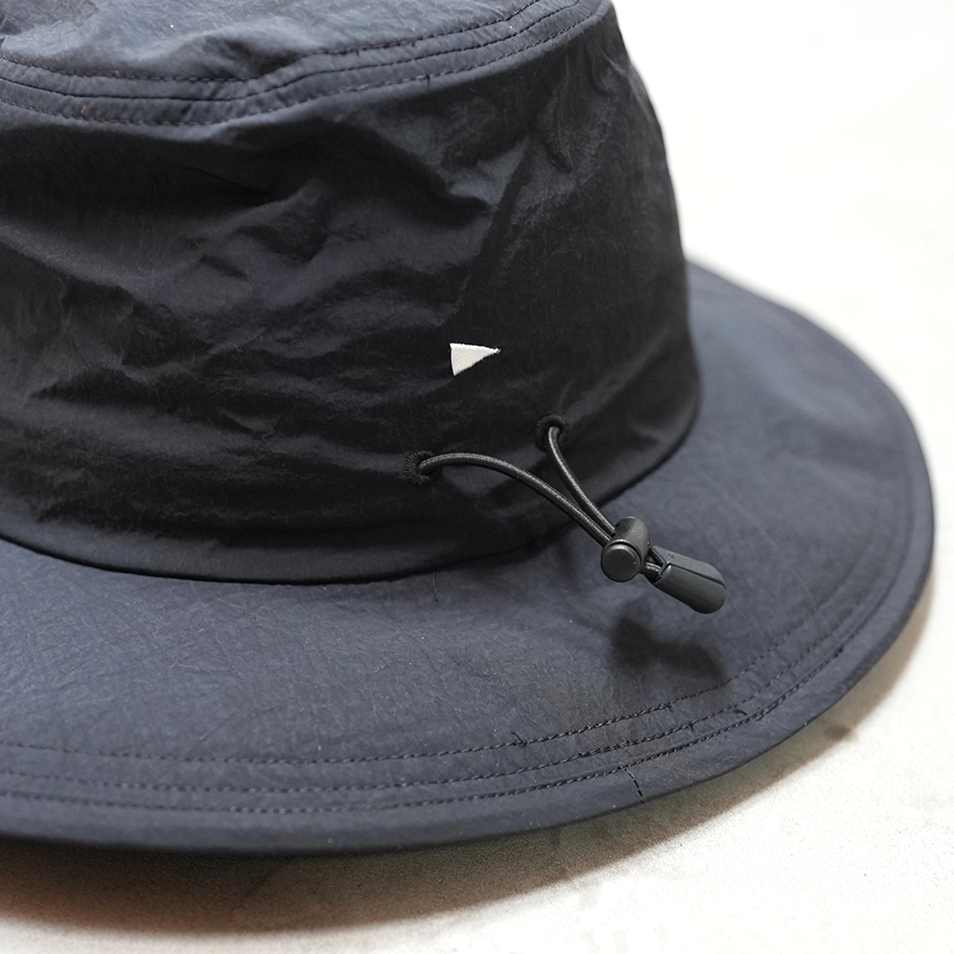 撥水加工を施したナイロン素材を使用したハット。程よい深さのクラウンにより、頭に安定してフィットし、日常からアウトドアまで幅広く活躍します。裏地には通気性に優れたメッシュ素材を使用し、蒸れを軽減。つば先にはワイヤーを内蔵し、好みに合わせて形状を調整可能です。さらに、背面のドローコードで被ったままのサイズ調整ができ、あご紐も備えているため風の強い日でも安心して着用できます。