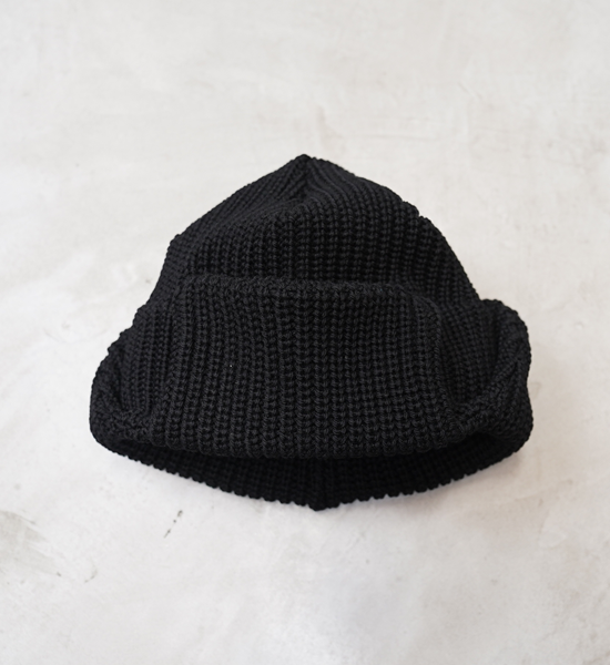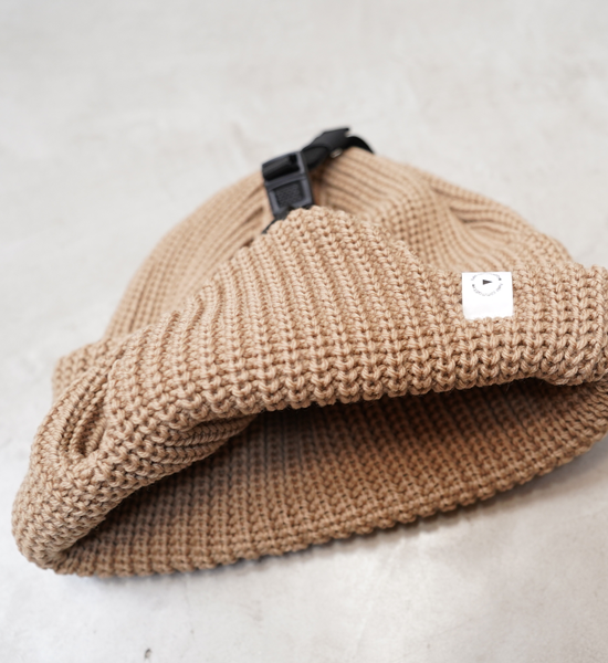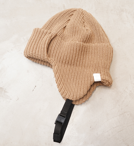 エアリーでやわらかいウール糸を使用したフライトキャップニット帽。 ストレッチ素材のような伸縮性を持ち、トップ部分を1枚仕立てに切り替えることで、より軽やかな着用感を追求しました。