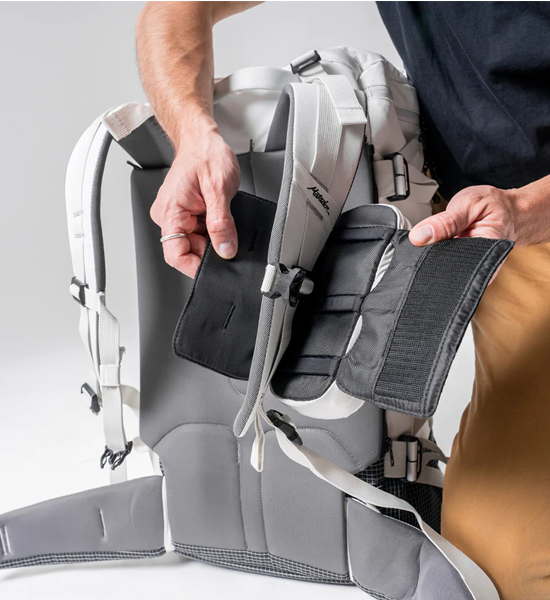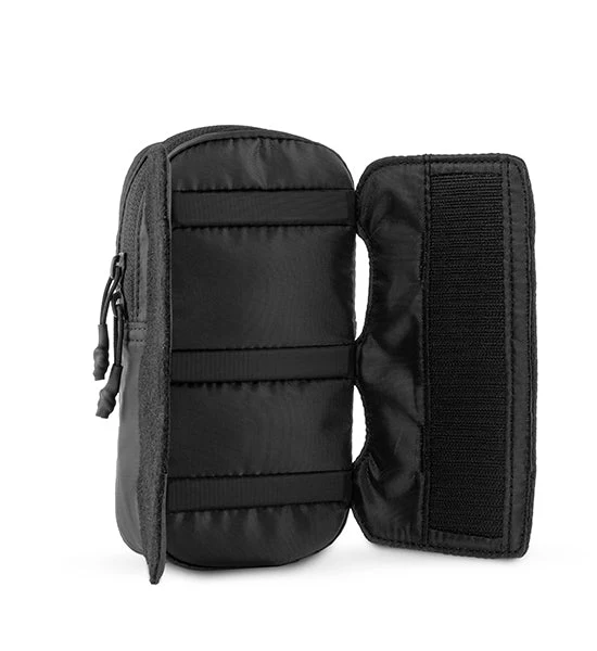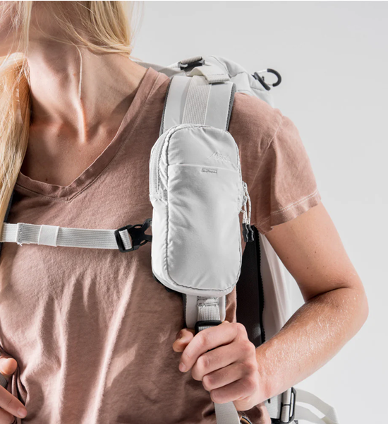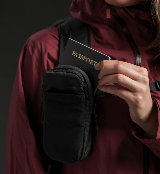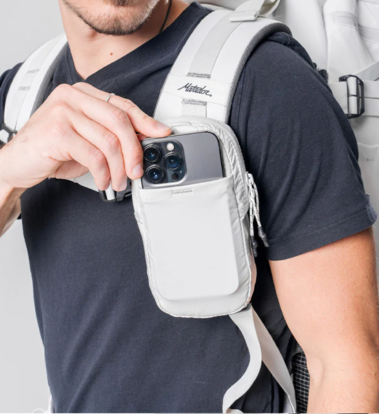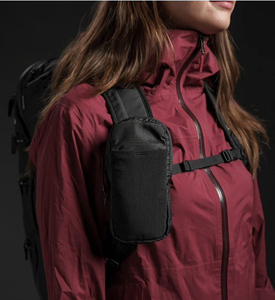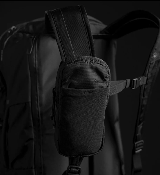 マタドール スピードスタッシュは、バックパックのショルダーハーネス等に取り付けて携帯電話やカード、財布などの小物を管理することができるアクセサリーです。トラベルやアウトドア、デイリーユースでの使用に最適です。スピードスタッシュはスターナムストラップが付いているバックパックであれば、バックルを外した状態でも安定して取り付けることができます。