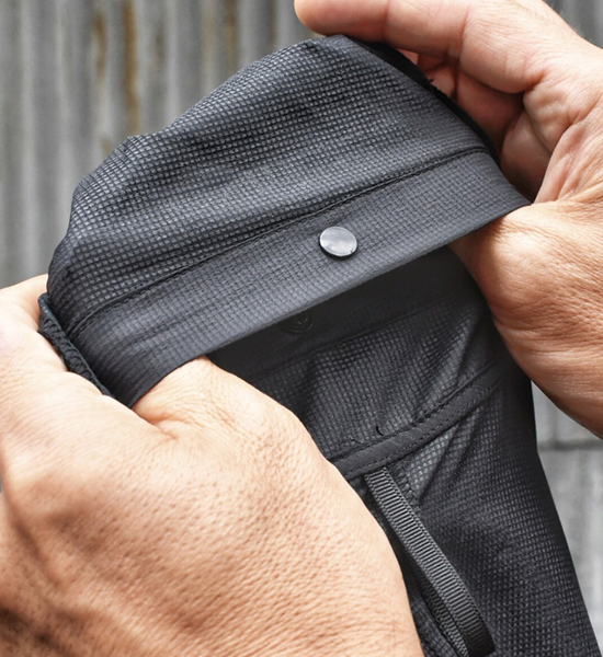 素材はナイロン(20d)の細い糸を縦横ダブルリップの組織で織り込み、凸凹を表現することに成功。肌離れの良さ、通気性、そして強度とバランス良く保っています。また軽量化を図るため、ポリウレタンは一切使わずにナイロンでストレッチ感を出しています。