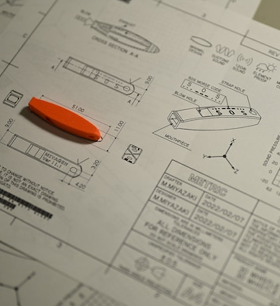 この商品は3Dプリンターの強みを活かして金型では不可能な設計をしています。2gという重量であっても約120dBという音が出るようになりました。