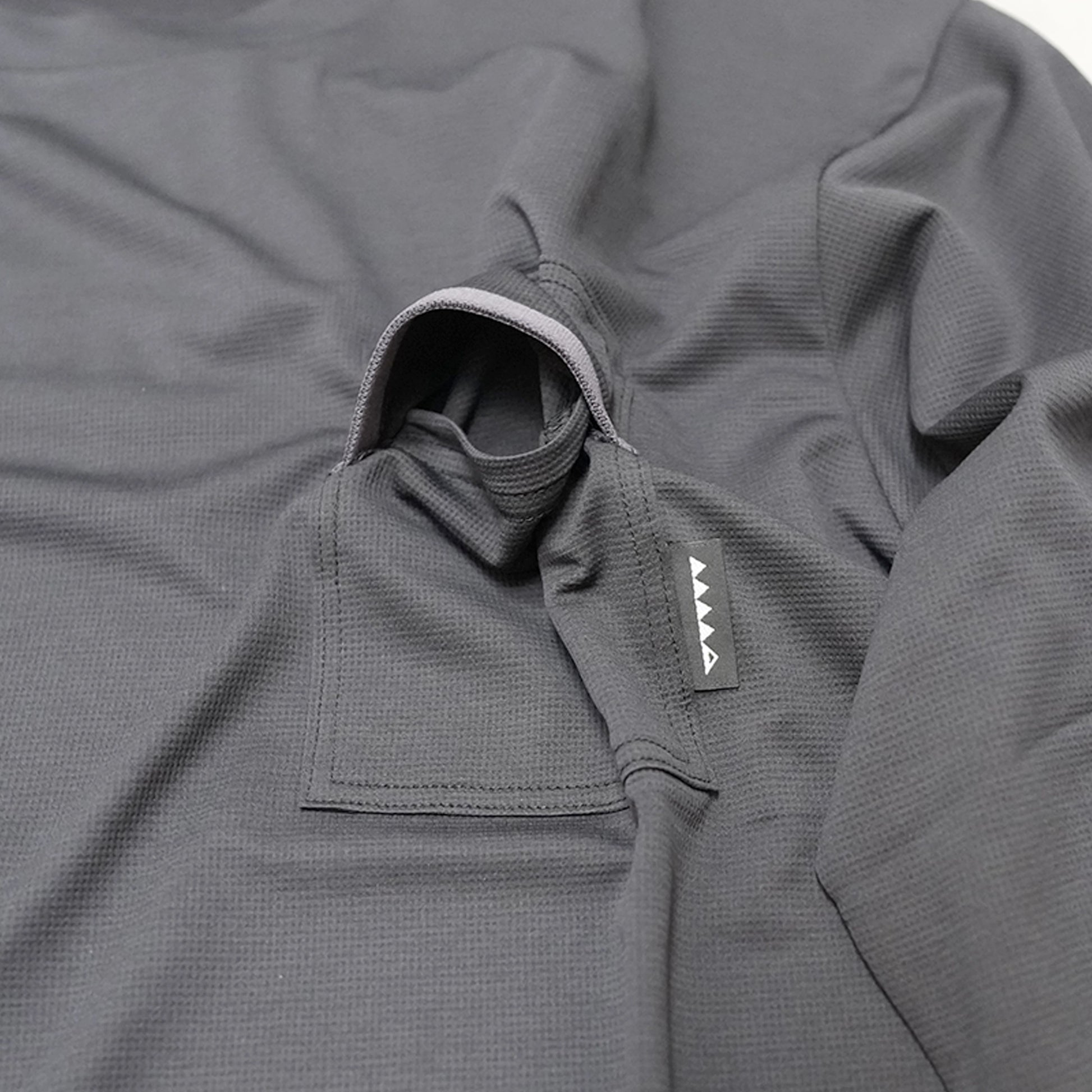 ポケットはバインダーテープにより落としにくい形状。裾にはスリットが入り、背面が長いクラシカルなディティール。背面下部をMMAオリジナル柄に切り替えています。本体素材は凹凸感のある軽量な機能素材を使用。肌面は撥水糸で汗をかいてもべたつかず、吸水速乾と抗UV機能を備えます。しなやかで肌触りがよく、ライトアクティビティから長時間のヘビーアクティビティにも対応します。天然素材に比べ、洗濯しても速く乾くメンテナンス性のよさも魅力のひとつ。