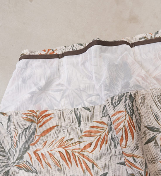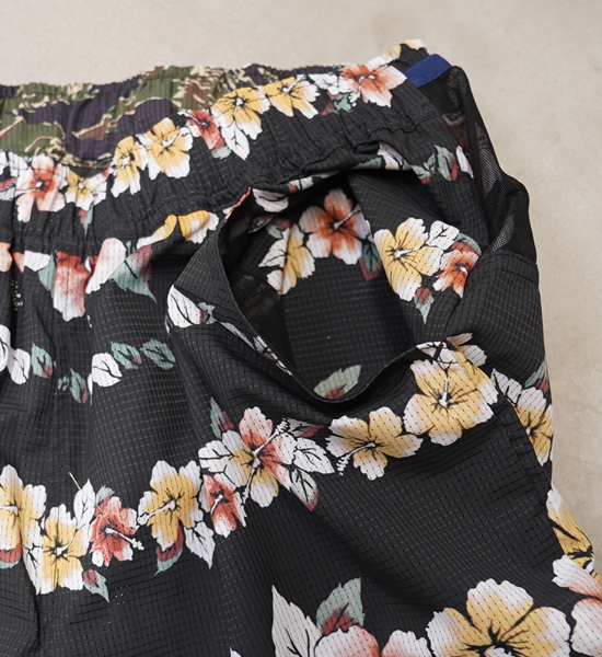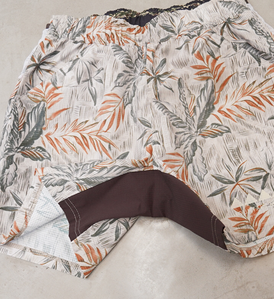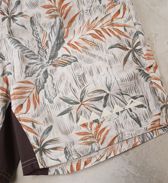長く愛されるヴィンテージウェアは、失われることのない魅力と普遍の価値観を持っている。そこに「機能」という価値をプラス。競技からタウンユースまで。ヴィンテージアロハをサンプリングしたランニングパンツです。日本製のオリジナルボディは、背部のパワーメッシュ三連ポケットが特徴。補給や鍵、スマートフォン、パッカブルウィンドシェルなどが収納可能な大容量。足の稼働域を広げるガゼット部分は、ストレッチ素材を使用。ウエストはゴム+紐で調整可能です。素材は通風孔があり通気性の高い東レの撥水素材「Dot Air®」を使用。吸水速乾・ストレッチ機能に加えて薄く軽量で、長時間着用していてもストレスを感じません。ヴィンテージメゾンアロハ柄を機能を損なわない昇華転写で全面プリント。ヴィンテージの味わいはそのままに、機能を加えることで着るシーンを選びません。街、海だけではなく、山でもヴィンテージ と機能の良さを味えるプロダクト。