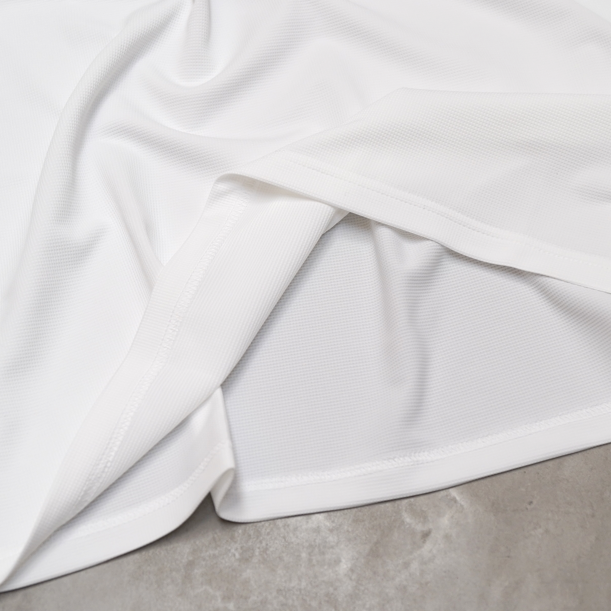 日本製のオリジナルボディは、肩幅と身幅を大きくアレンジしたゆったりシルエットで、肩からゆるやかに落ちたショルダーやゆとりのある身幅は着やすくやわらかい印象です。脇のガゼットにより立体的な構造で、縫い目をフラットにすることで着用感を向上。ガゼット下部のポケットは補給などを入れることが可能です。本体素材は、凹凸感のある軽量な機能素材を使用。肌面は撥水糸で汗をかいてもべたつかず、吸水速乾と抗UV 機能を備えます。光沢感を抑えたナチュラルな風合いで、しなやかで肌触りがよいです。洗濯しても早く乾くメンテナンスのよさも魅力のひとつです。