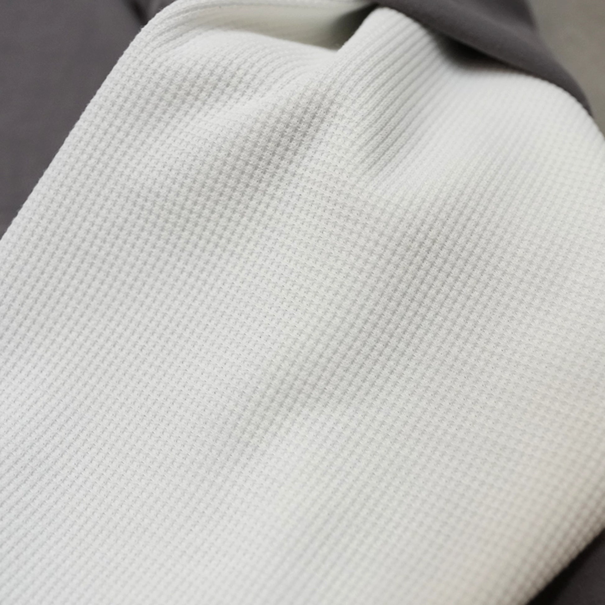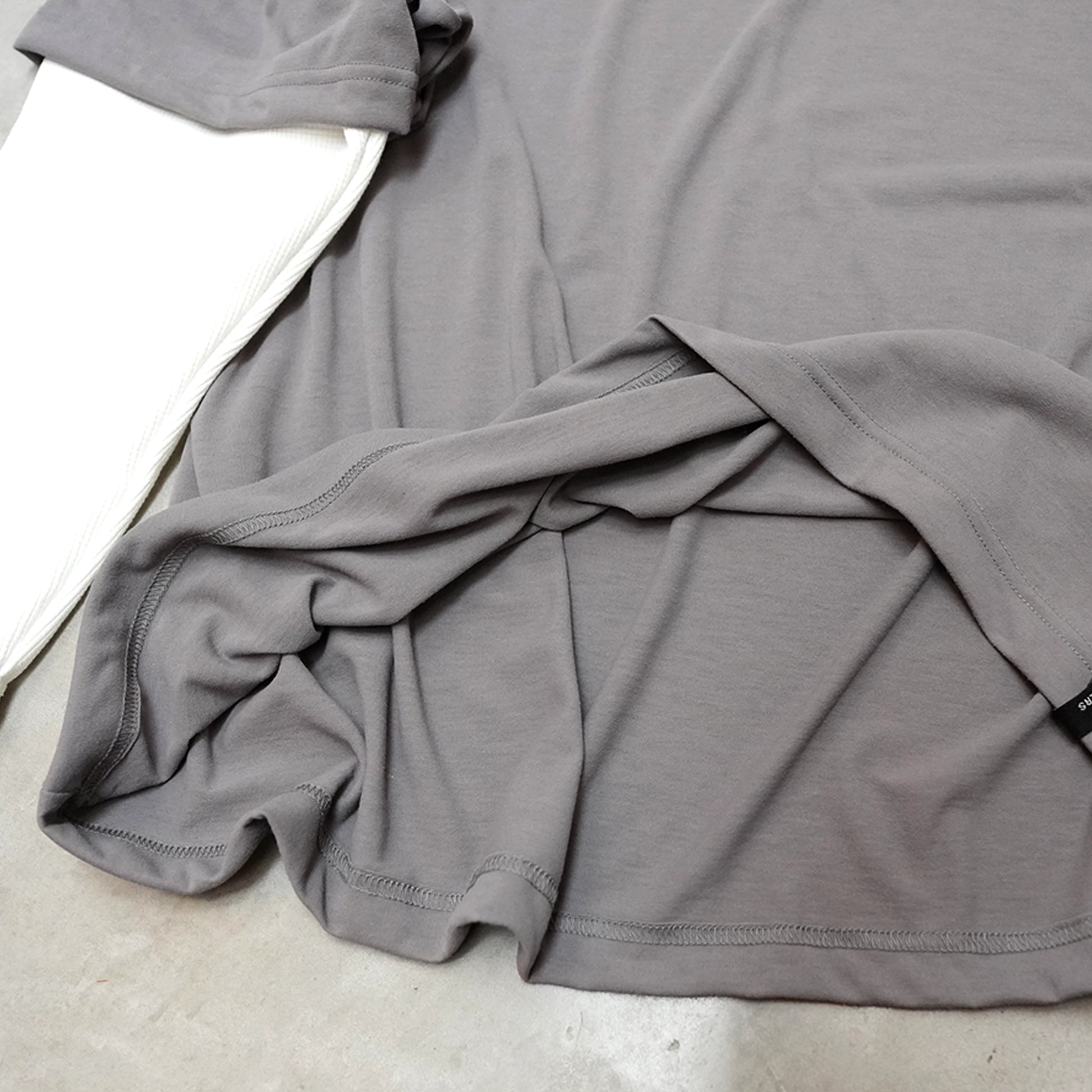 速乾天竺と速乾ワッフルを組み合わせたレイヤードTシャツ。アームホールから重なる異なる素材のコントラストが映える一枚。背面にはA.M.プリント入り。素材は共にポリエステル。速乾性はもちろん、ライトな着心地もポイントです。