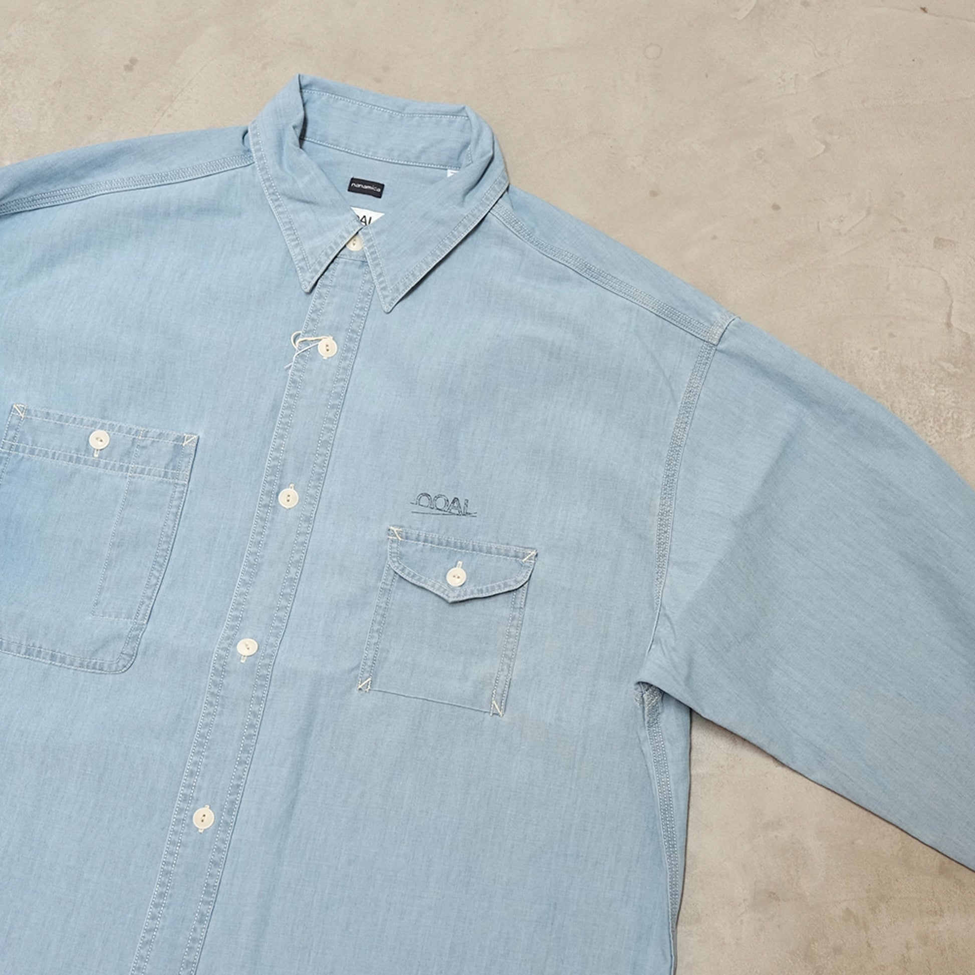 ポリエステルの外側をコットンで覆った2層構造のカバーリングコアヤーンをロープ染色し、シャンブレー素材を製作。コットンの肌触りに、軽量且つ耐久性があり乾きやすいという機能性をプラスしたnanamicaオリジナルのハイブリッド素材。身頃のボリューム感が特徴のゆったりとしたフィットです。胸ポケット上にはOOALプリント。