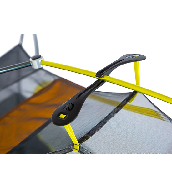トライアングル形状のガイアウトポイントとコーナーストラットにより足先部分のサイドウォールが立ち上がり、シュラフがテントウォールに触れるのを防ぎます。