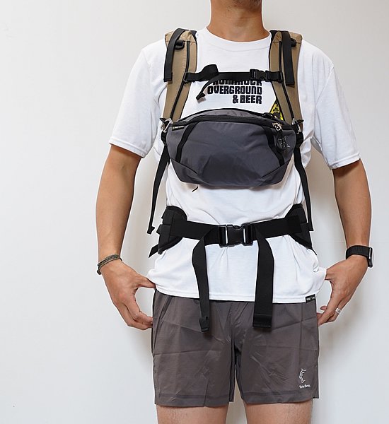 肩掛けしてショルダーバッグとして、またザックにウエストベルトがなければウェストポーチやサイドバッグとして、更にはベルトを外してザックのチェストハーネスと接続しチェストバッグとして使用したりと、多彩な使い分けができます。