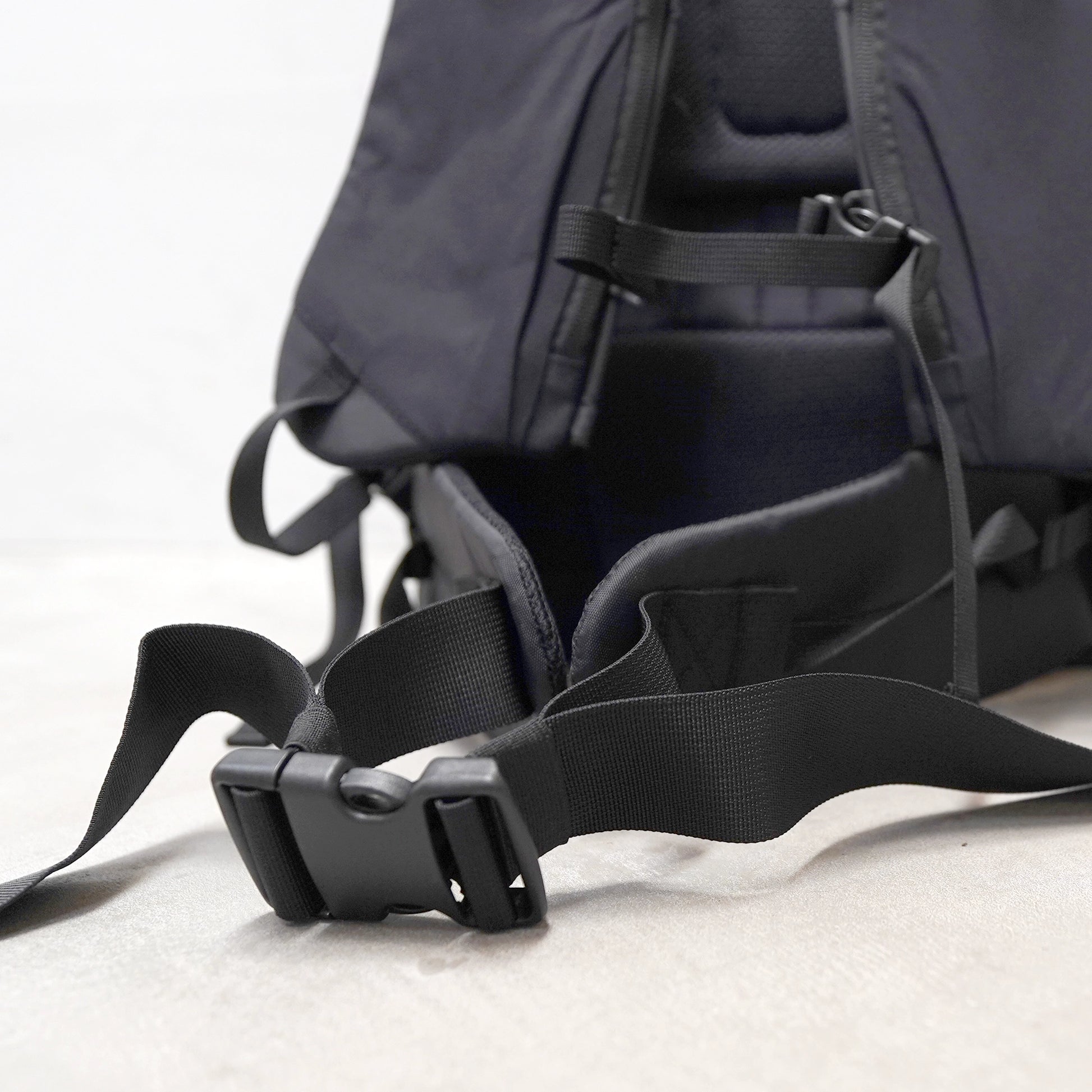 幅広のショルダーハーネスがバッグの荷重を肋骨全体に分散し、驚くほどの安定感を実現。歩行時の揺れを減らすとともに肩への負担も軽減する、RUSHゆずりの快適な背負い心地です。