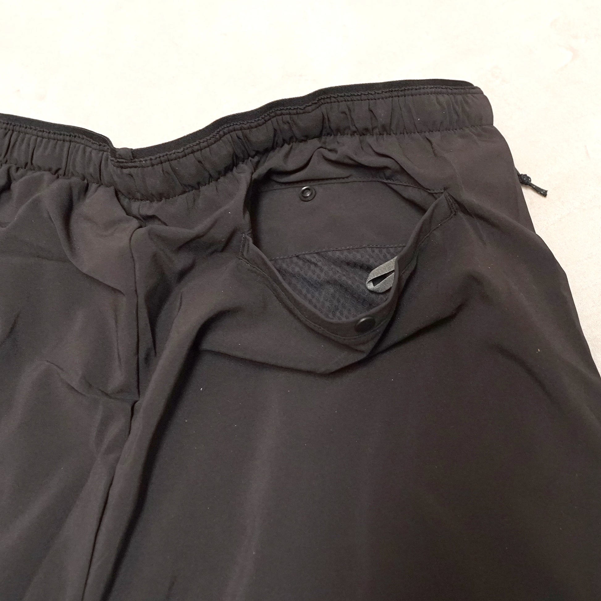 ・ジッパー式フロントポケットが2つ。ヒップのスナップ留めポケットにはショーツ本体を収納可能で、携帯や保管が容易