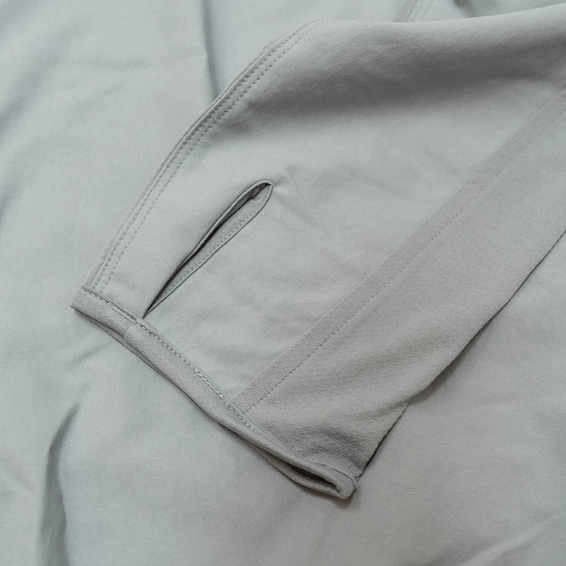 本体はストレッチ平織りのリサイクル・ポリエステル100%、袖のパネルとフードはリサイクル・ポリエステル100%のジャージー。両素材とも吸湿発散性を備え、UPF(紫外線防止指数)40+のUVプロテクションを提供