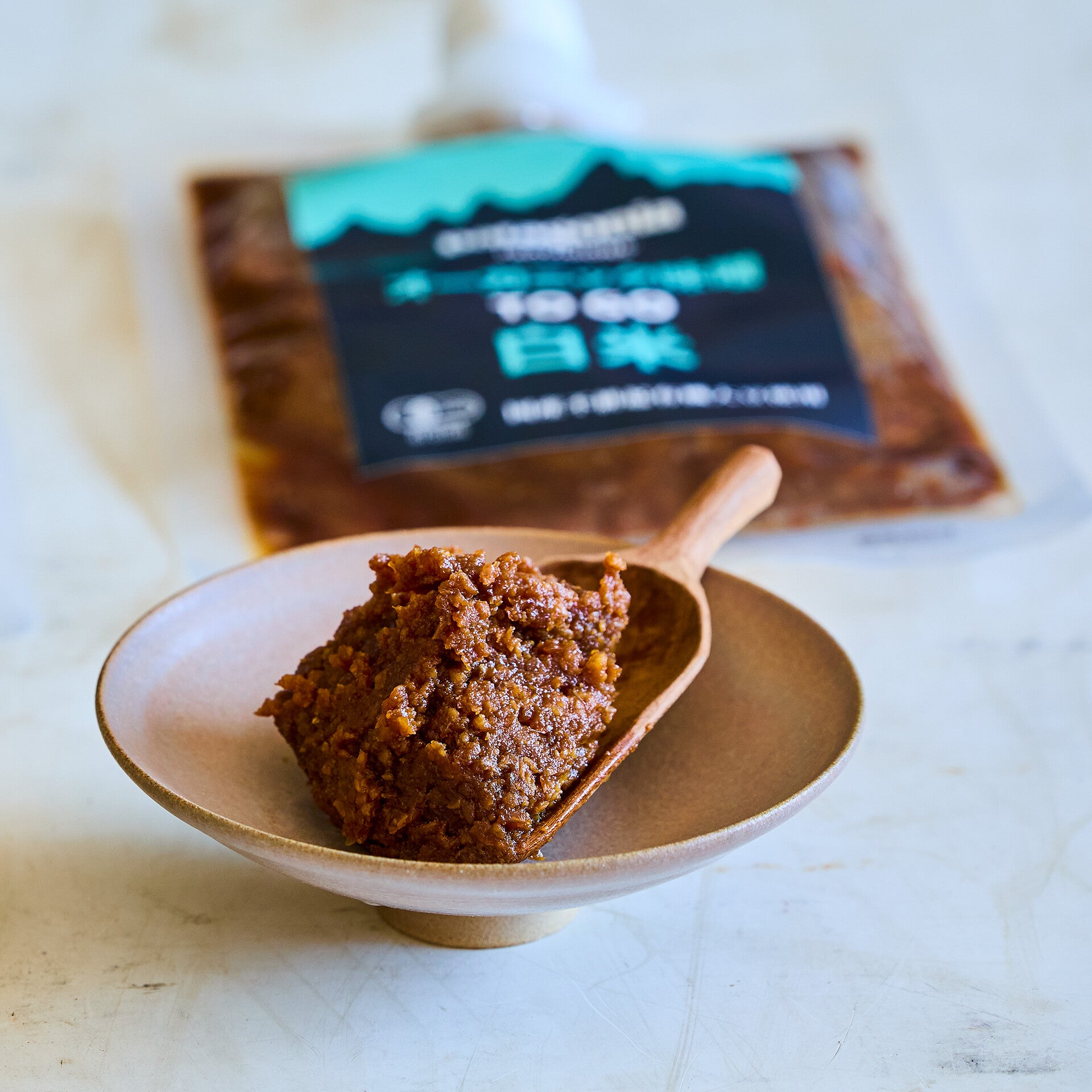 ソーラーシェアリングの下、土壌を再生する農法で、リジェネラティブ・オーガニック認証取得をめざす千葉県産不耕起有機大豆を使用。自家採種の蔵つき麹菌で、非加熱で約10か月、天然醸造で長期熟成した甘口味噌です。福井県日野川の伏流水を水源とする地下水を使用。白米味噌の甘みが、料理や味噌汁を引き立てます。持ち運びしやすいパッケージ。