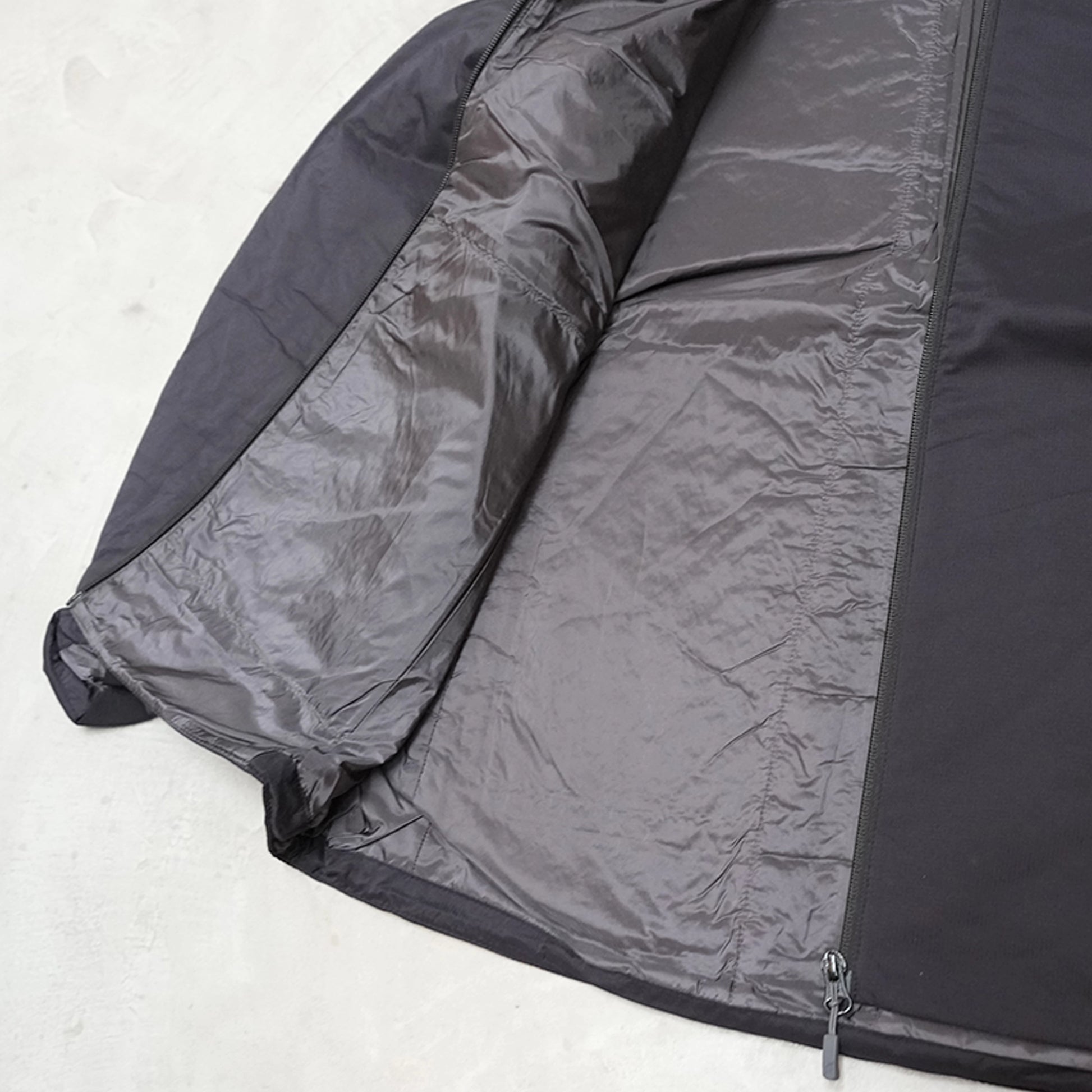 表地:20D Pertex Quantum Air 20デニールナイロン DWR耐久撥水加工 ライニング: 20D リサイクルナイロン (41gsm) 60gsm Primaloft Gold Insulation Active+ (55% Recycled Content)をフロント、バック、袖と襟の上部に使用 40gsm Primaloft Gold Insulation Active+ (55% Recycled Content)をサイド、脇の下、背骨、フードの上に使用 |