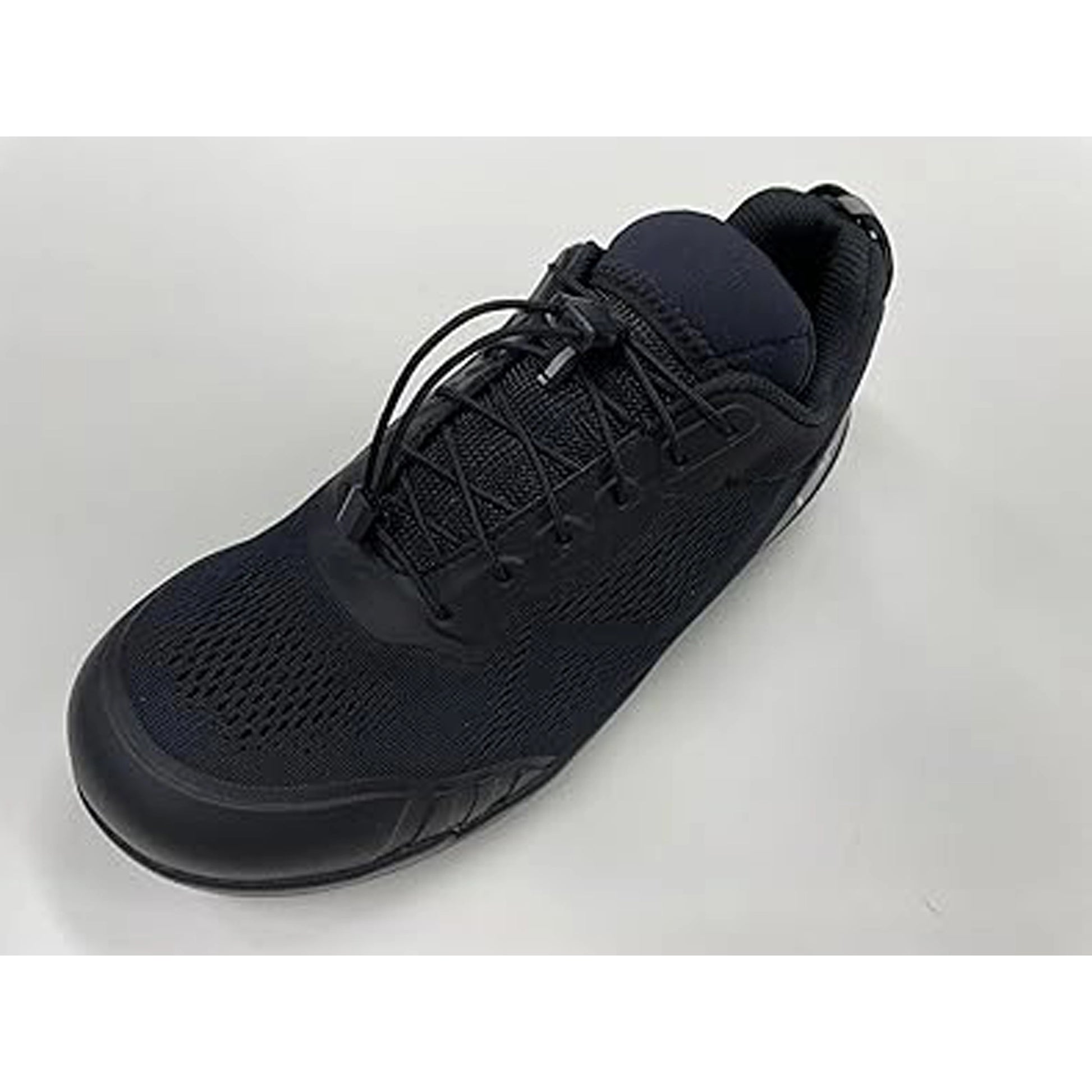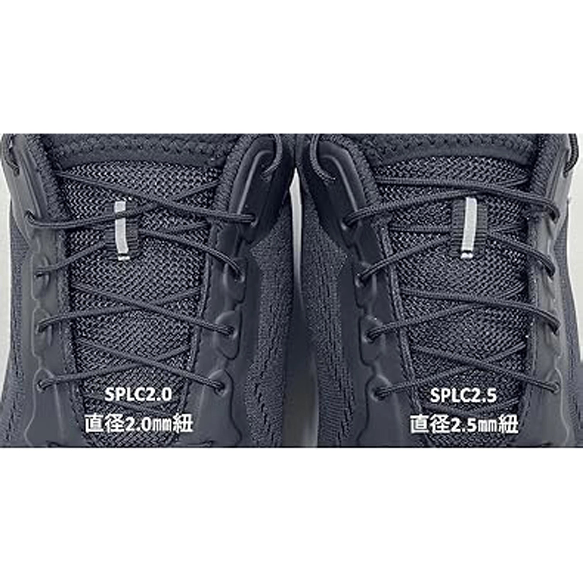 2.5mmの伸縮性のない紐を使用しております。2.0㎜紐と比較して、足当たりがやわらかいのが特徴です。先端はフック付きのエンドパーツにアップデートしており、余り紐をフッキングして留めることが可能です。