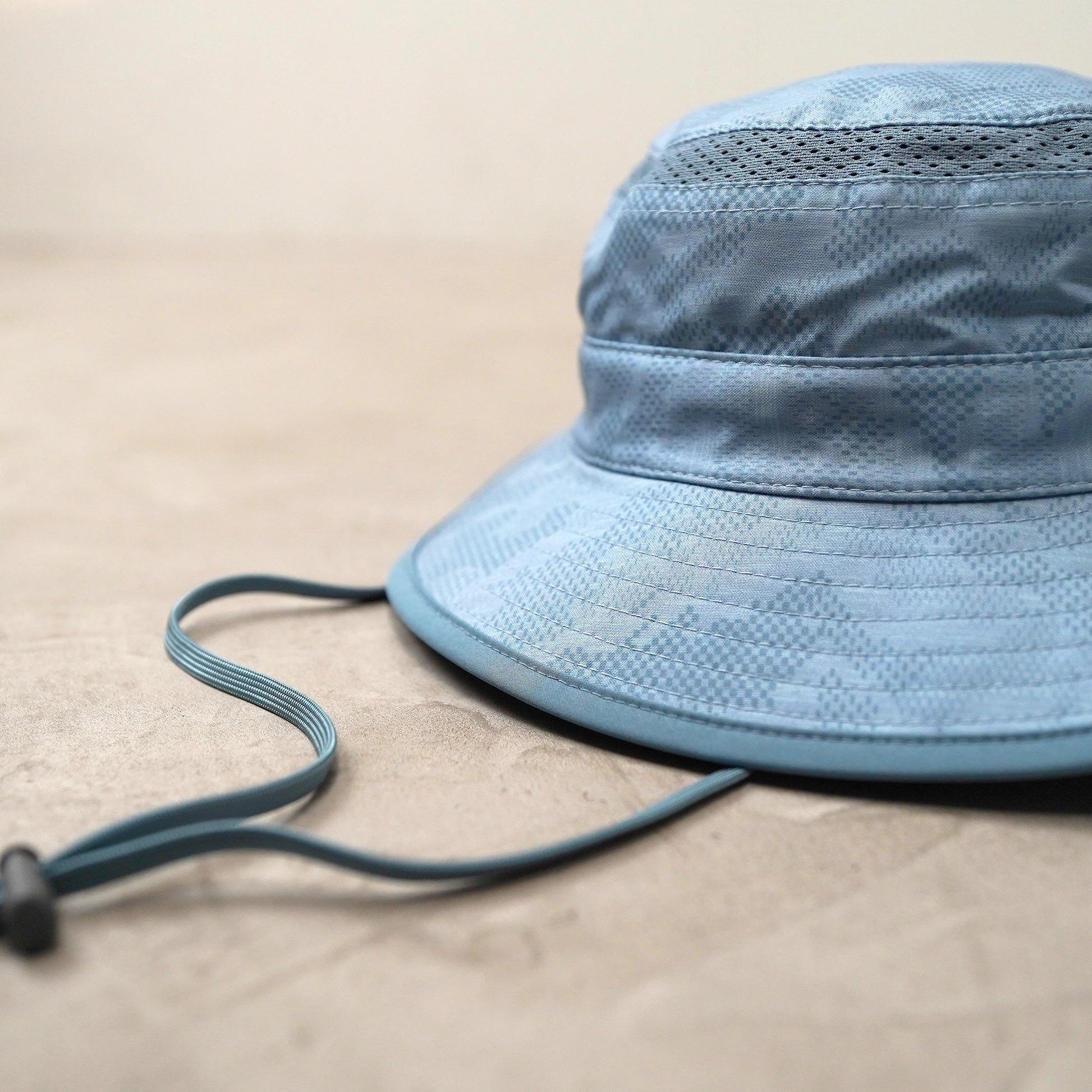 新しいソーラーバケットは認証済みのリサイクルナイロンを使用。頭のまわりにはぐるっとメッシュで頭頂部にはポケット付き。もちろんUPF50+の日焼け防止効果を備えています。短めのツバで視界も良好です。