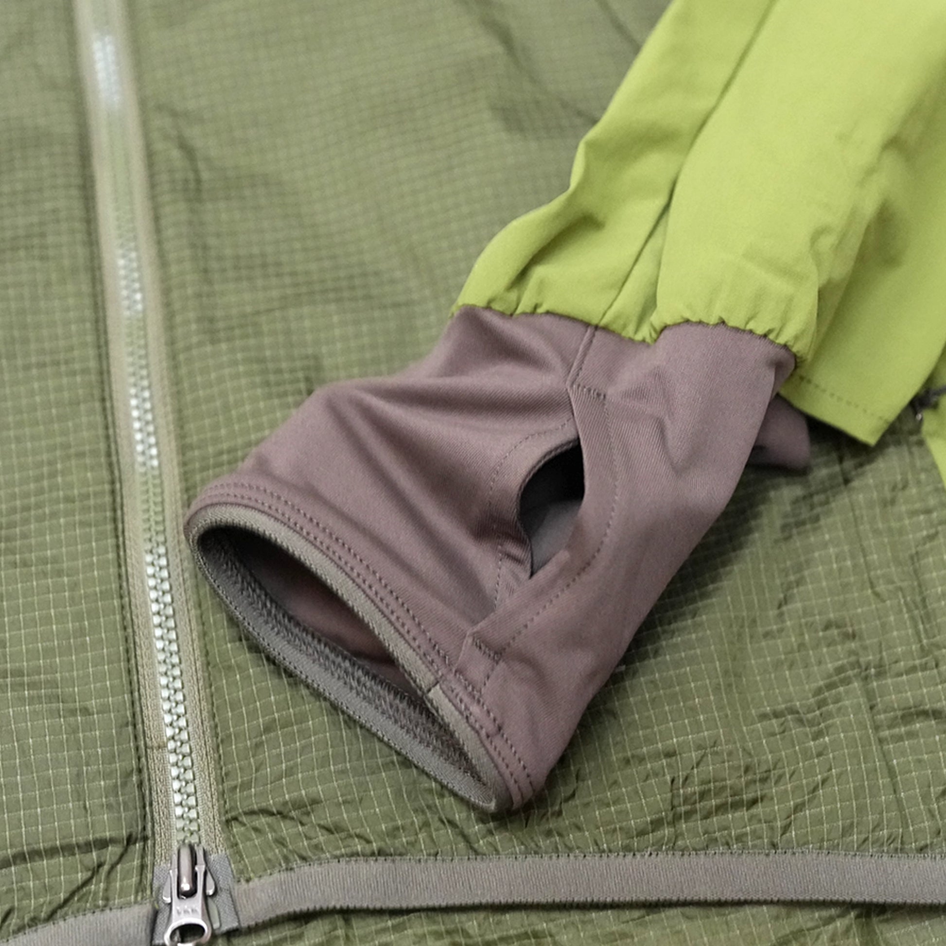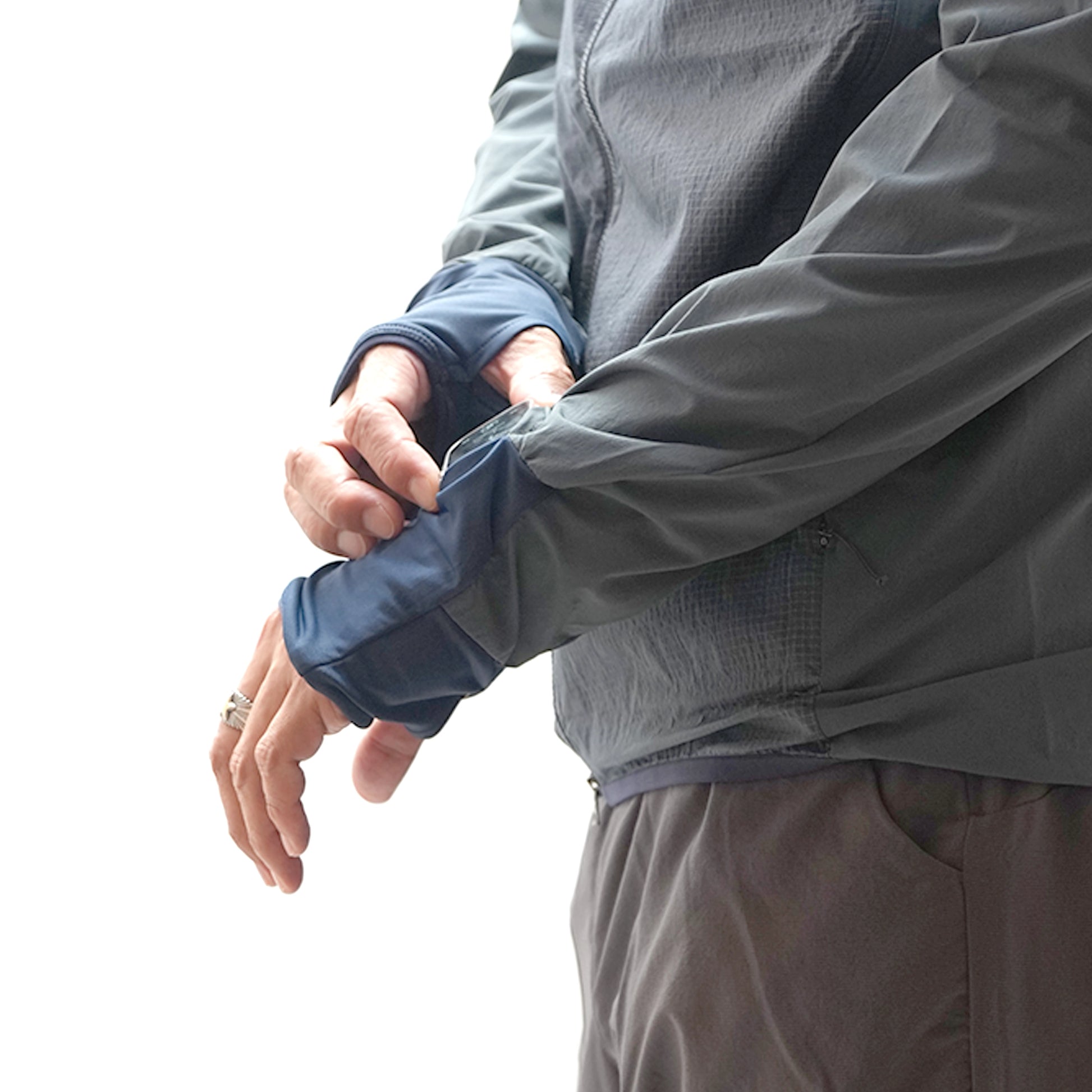 秋冬のマウンテンランニングを想定した新作のウインドシェルです。メインの素材は、通気性とストレッチ性を高く、汗をかいたときも肌離れが良いソフトシェル。冷たい風を受けて生地が肌に触れたときも冷気が伝わりにくい一方で、通気性があるためオーバーヒートもしにくくなっています。肩から前身頃と背中のウエスト部分には、防風性と耐久性に優れるHPPE(ハイパフォーマンスポリエチレン)のリップストップ生地を使用。AERO JACKETと同様、両サイドにベンチレーション兼用の大型ポケット、右手首に小銭や鍵などを入れられるジッパー付きのポケット、左手首にはウォッチウィンドウを備えています。マウンテンランニングだけではなく秋冬の幅広いシチュエーションで重宝するウィンドシェルです。