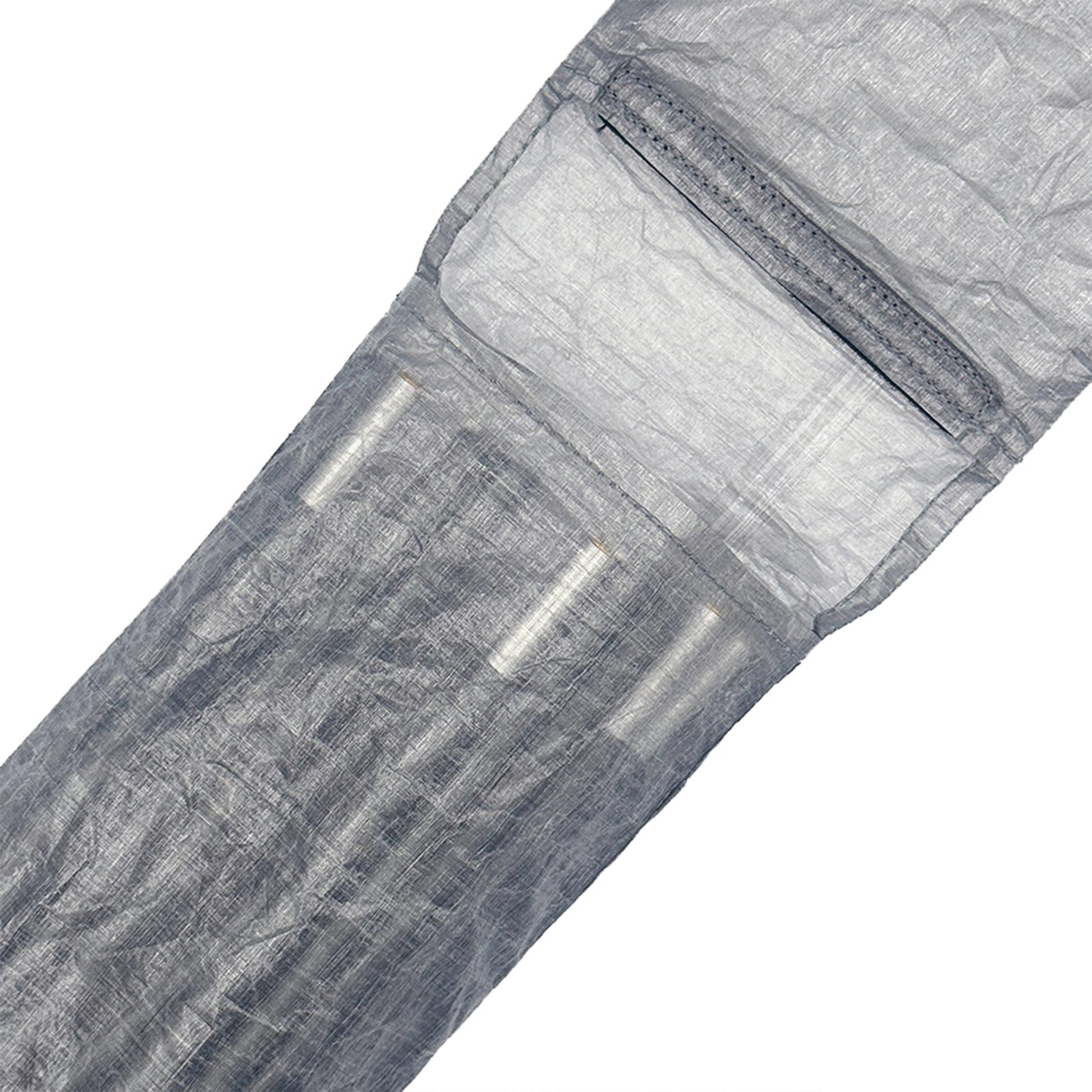 ハイカー向けのテントポールとペグを一括収納できるDyneema®製ケース。メインスペースにテントポール、トップRID部分にペグやガイラインを収められるポケットを配置。ケース自体の長さはテントポールに合わせて調整できます。テント場でポールのスタッフサックが飛んでしまったり、ペグケースだけ置き忘れるなどストレスを軽減します。素材は高い強度と超軽量なDyneema®製。防水性にも優れ、バッグ内部の湿気から中身を守ります。